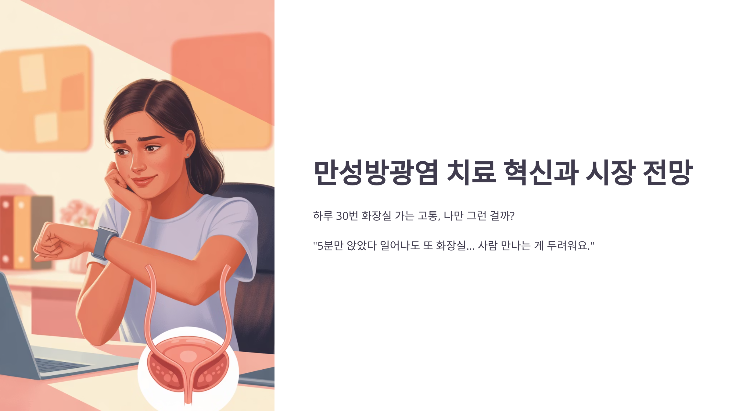 만성방광염 환자 급증은 단지 개인의 건강 문제가 아닙니다. 고령화와 여성의 사회활동 증가, 좌식근무 환경 확대는 방광 질환을 사회적 문제로 키웠습니다.