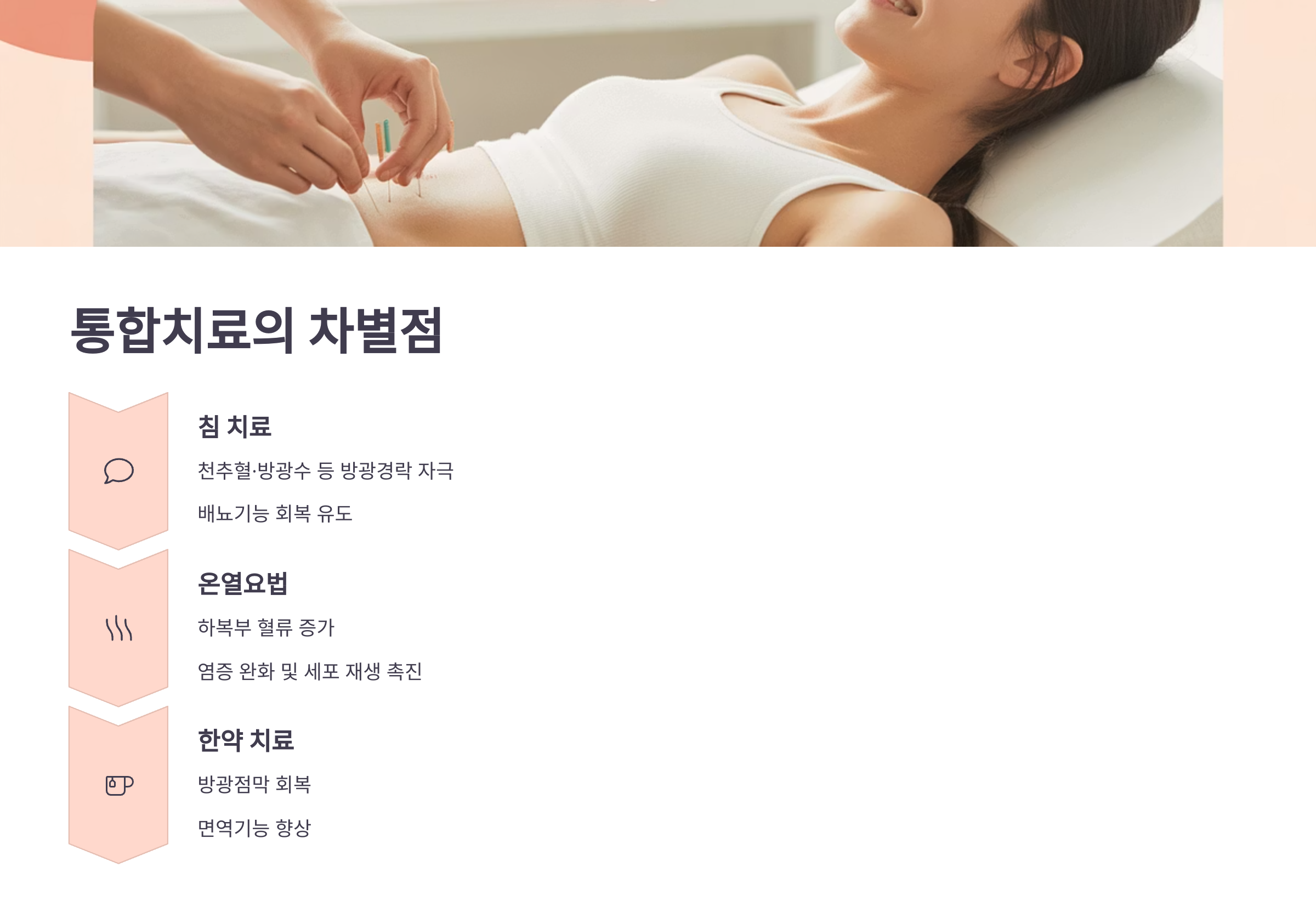 - 맞춤형 통합치료: 증상에 따라 침, 약, 온열요법 조합 가능