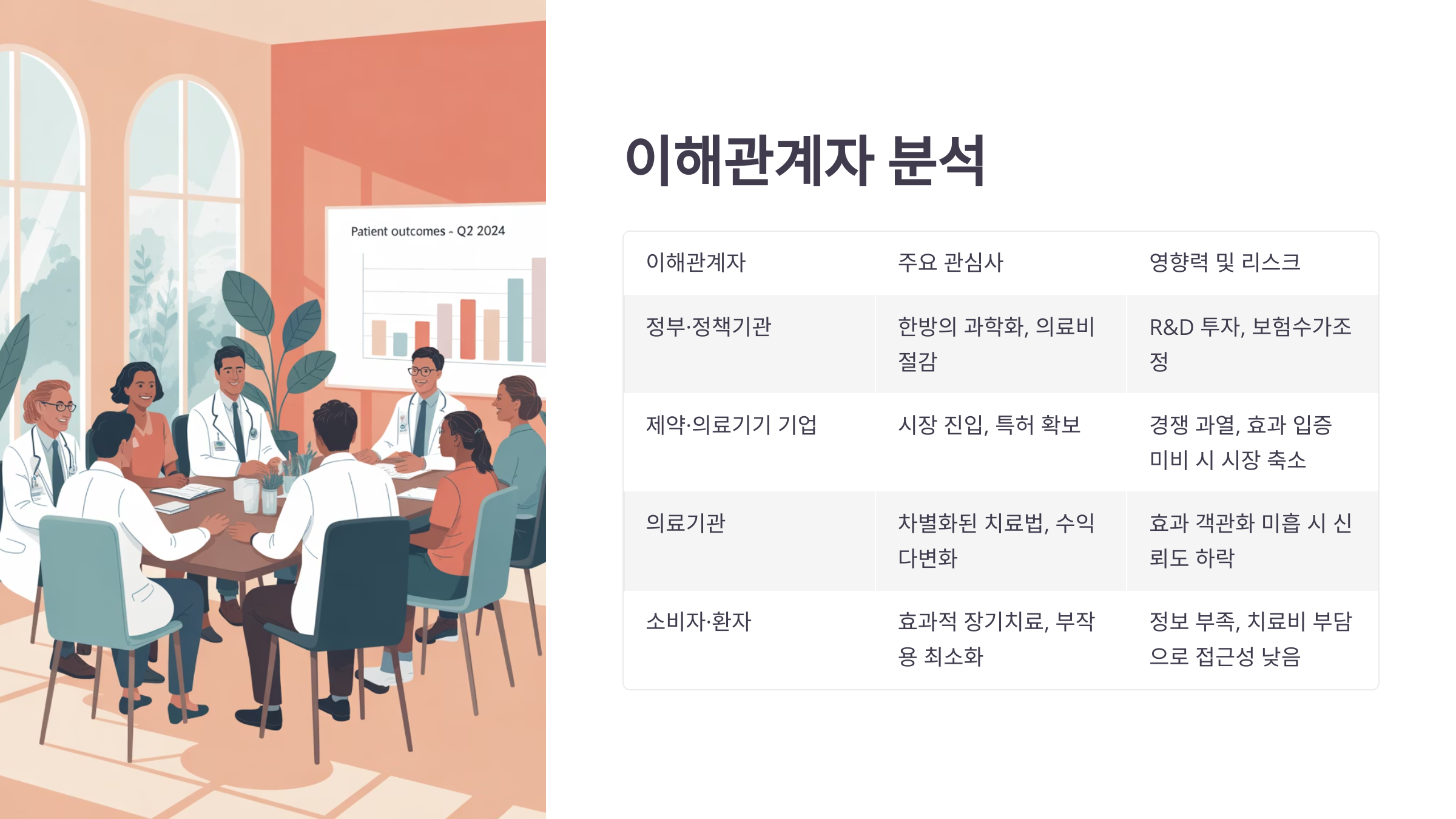| 소비자·환자 | 효과적인 장기치료, 부작용 최소화 | 정보 부족, 치료비 부담 등으로 접근성 낮음 |