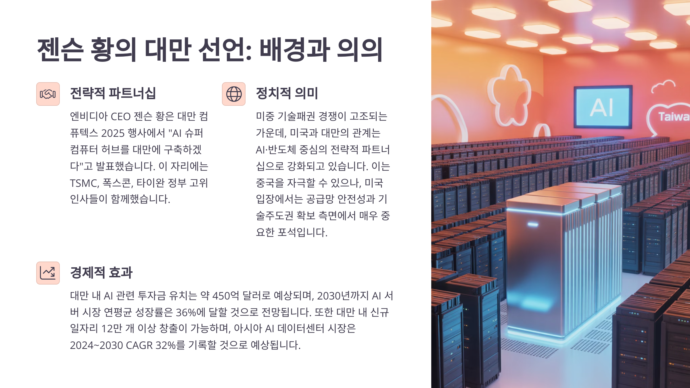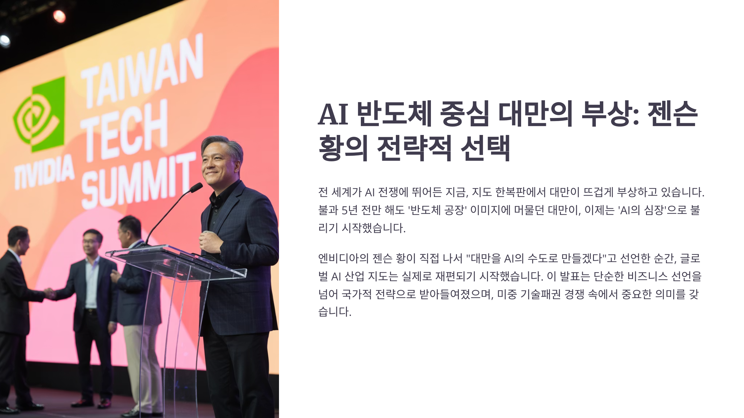AI 산업의 주도권은 단순히 기술의 문제가 아니라 국가 경제의 향방을 좌우하는 전략 자산이 되었다. 대만이 선택된 것은 우연이 아니다.