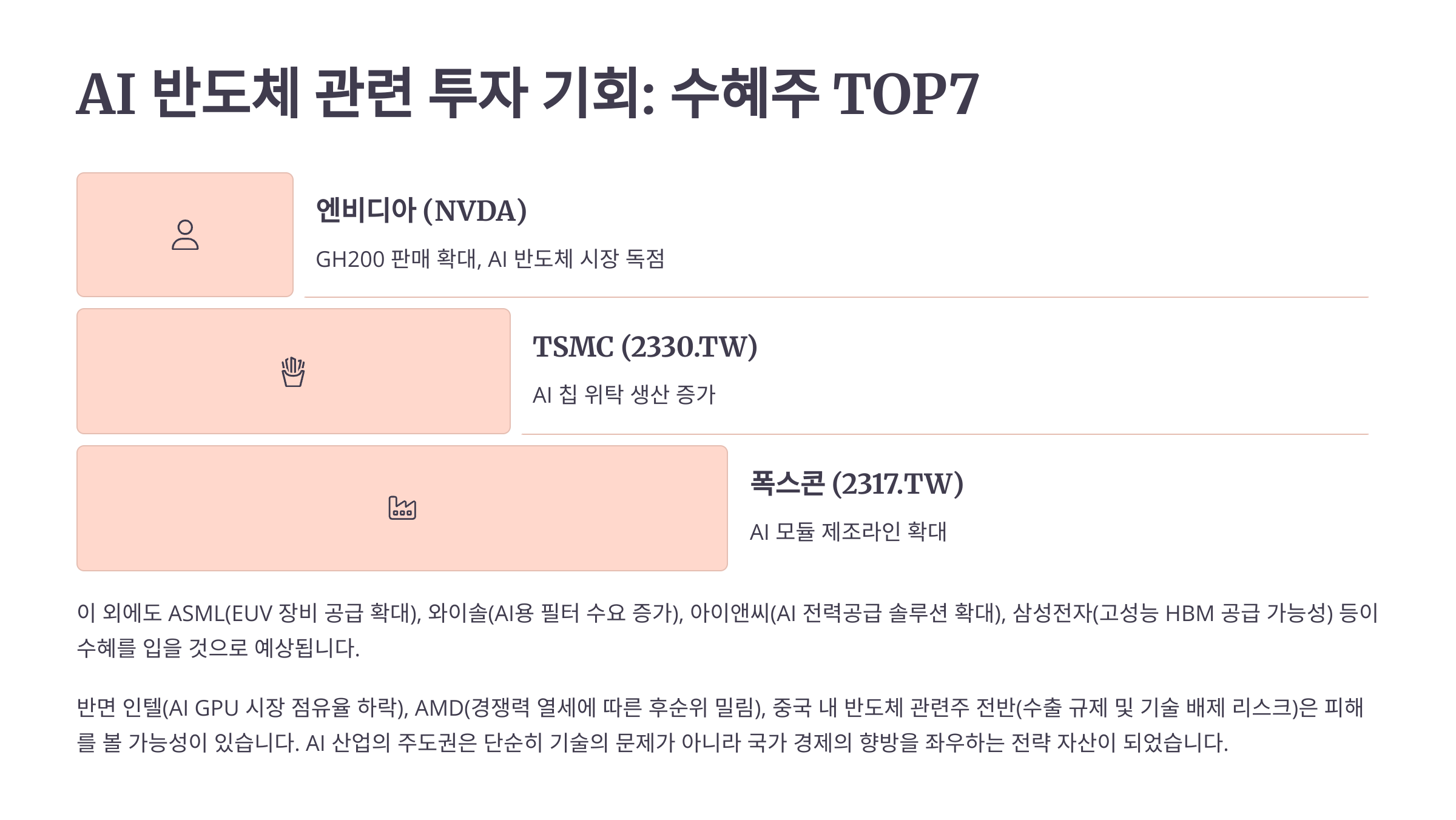 - 기업: 엔비디아(설계), TSMC(제조), 폭스콘(조립 및 모듈화) → 기술 상호보완