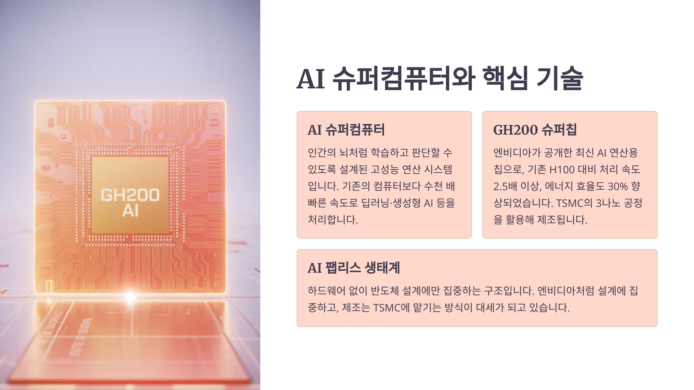 GH200 슈퍼칩: 엔비디아가 공개한 최신 AI 연산용 칩. 기존 H100 대비 처리 속도 2.5배 이상, 에너지 효율도 30% 향상. TSMC의 3나노 공정을 활용해 제조된다.