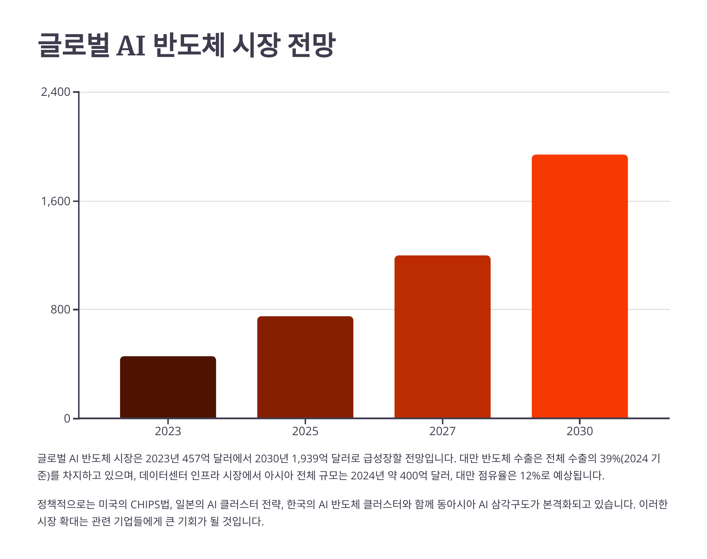 - 글로벌 AI 반도체 시장: 2023년 457억 달러 → 2030년 1,939억 달러