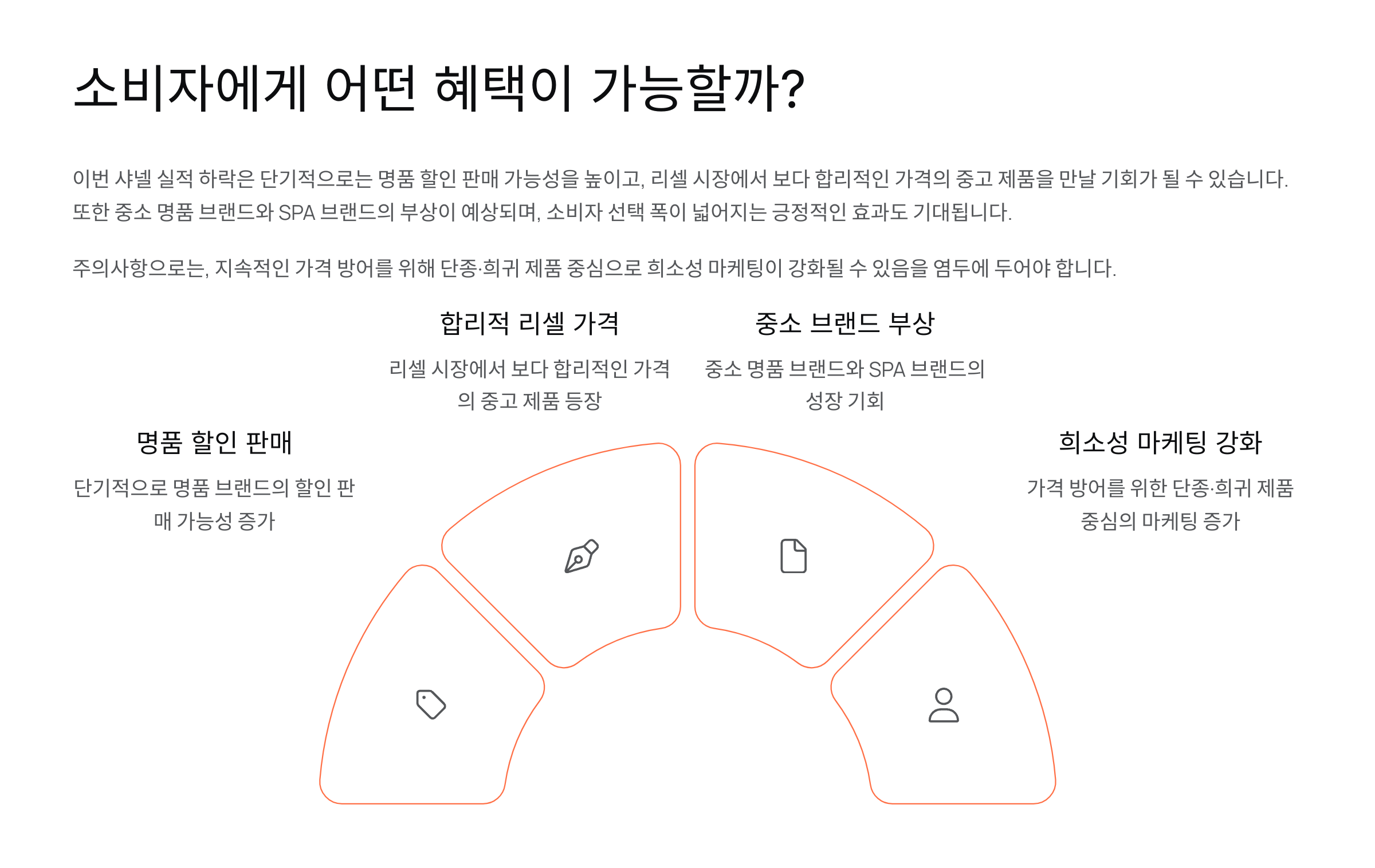 이번 샤넬 실적 하락은 단기적으로는 명품 할인 판매 가능성을 높이고, 리셀 시장에서 보다 합리적인 가격의 중고 제품을 만날 기회가 될 수 있습니다.