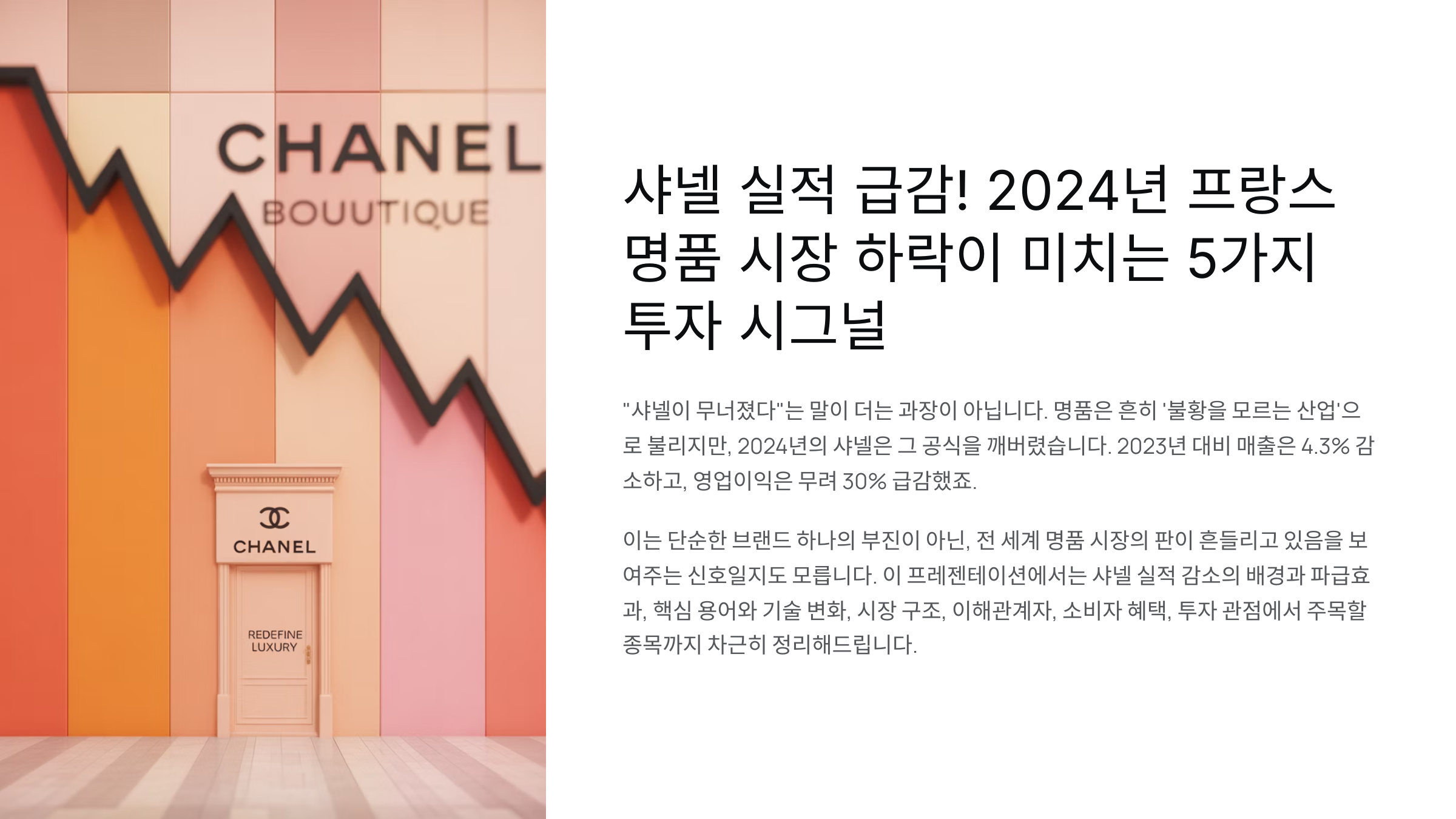 명품은 흔히 ‘불황을 모르는 산업’으로 불리지만, 2024년의 샤넬은 그 공식을 깨버렸습니다. 2023년 대비 매출은 4.3% 감소하고, 영업이익은 무려 30% 급감했죠. 이는 단순한 브랜드 하나의 부진이 아닌, 전 세계 명품 시장의 판이 흔들리고 있음을 보여주는 신호일지도 모릅니다.