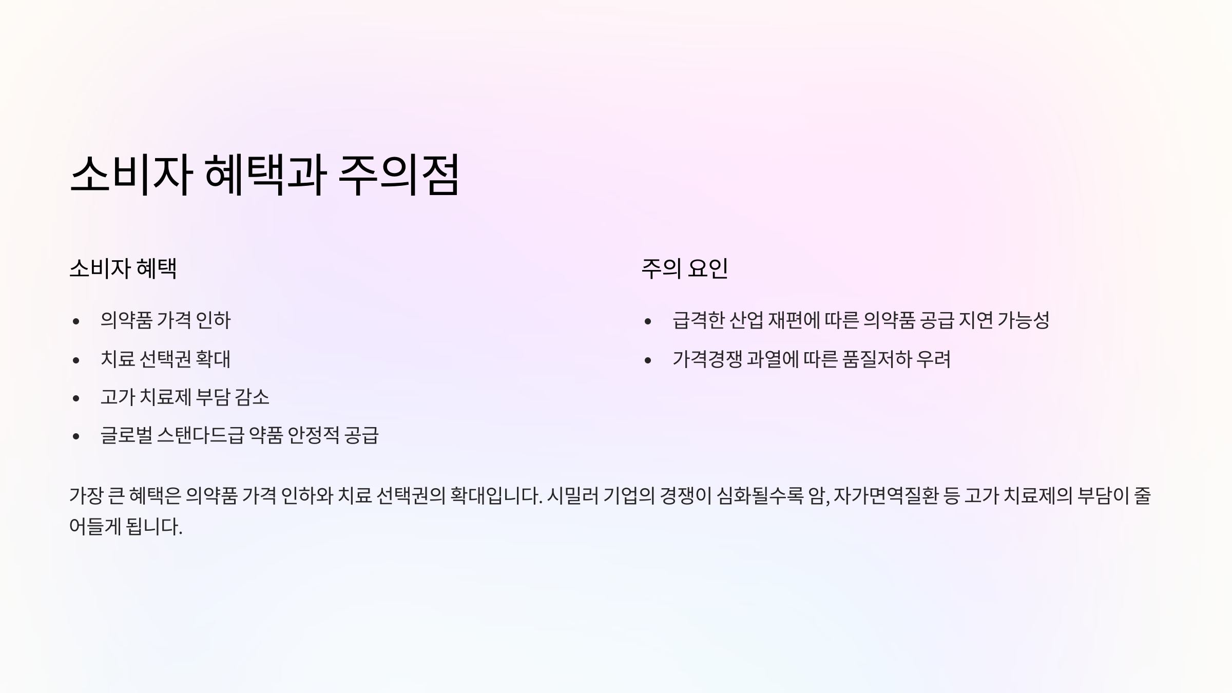가장 큰 혜택은 의약품 가격 인하와 치료 선택권의 확대다. 시밀러 기업의 경쟁이 심화될수록 암, 자가면역질환 등 고가 치료제의 부담이 줄어든다. 또한 CDMO 품질 신뢰도가 높아짐에 따라 국내 환자들도 글로벌 스탠다드급 약을 안정적으로 공급받을 수 있다.
