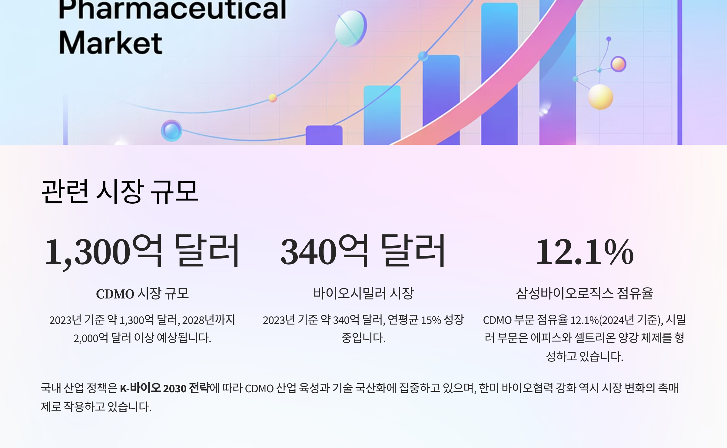 - CDMO 시장 규모: 2023년 기준 약 1,300억 달러, 2028년까지 2,000억 달러 이상 예상