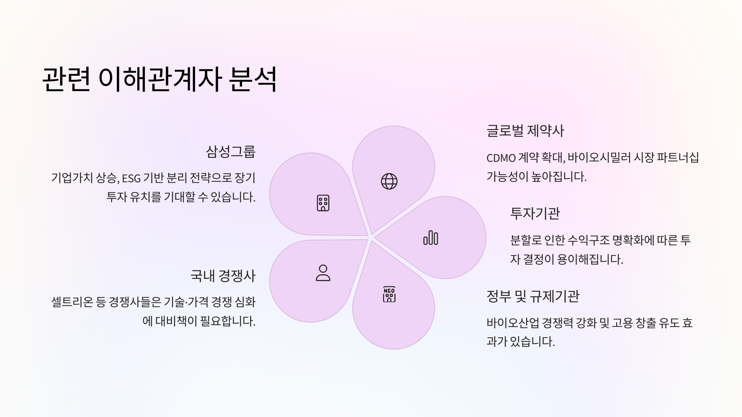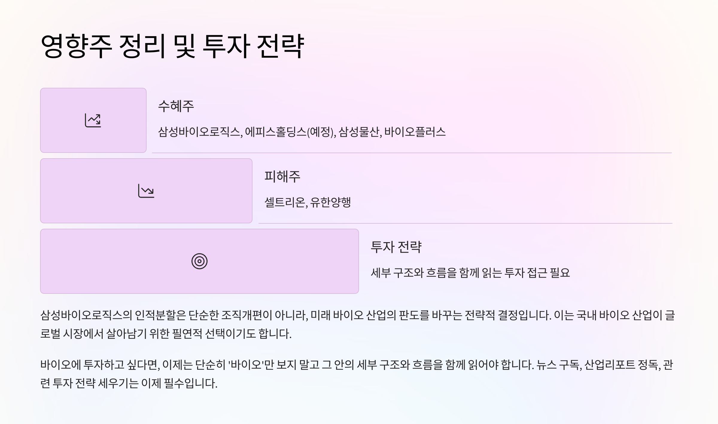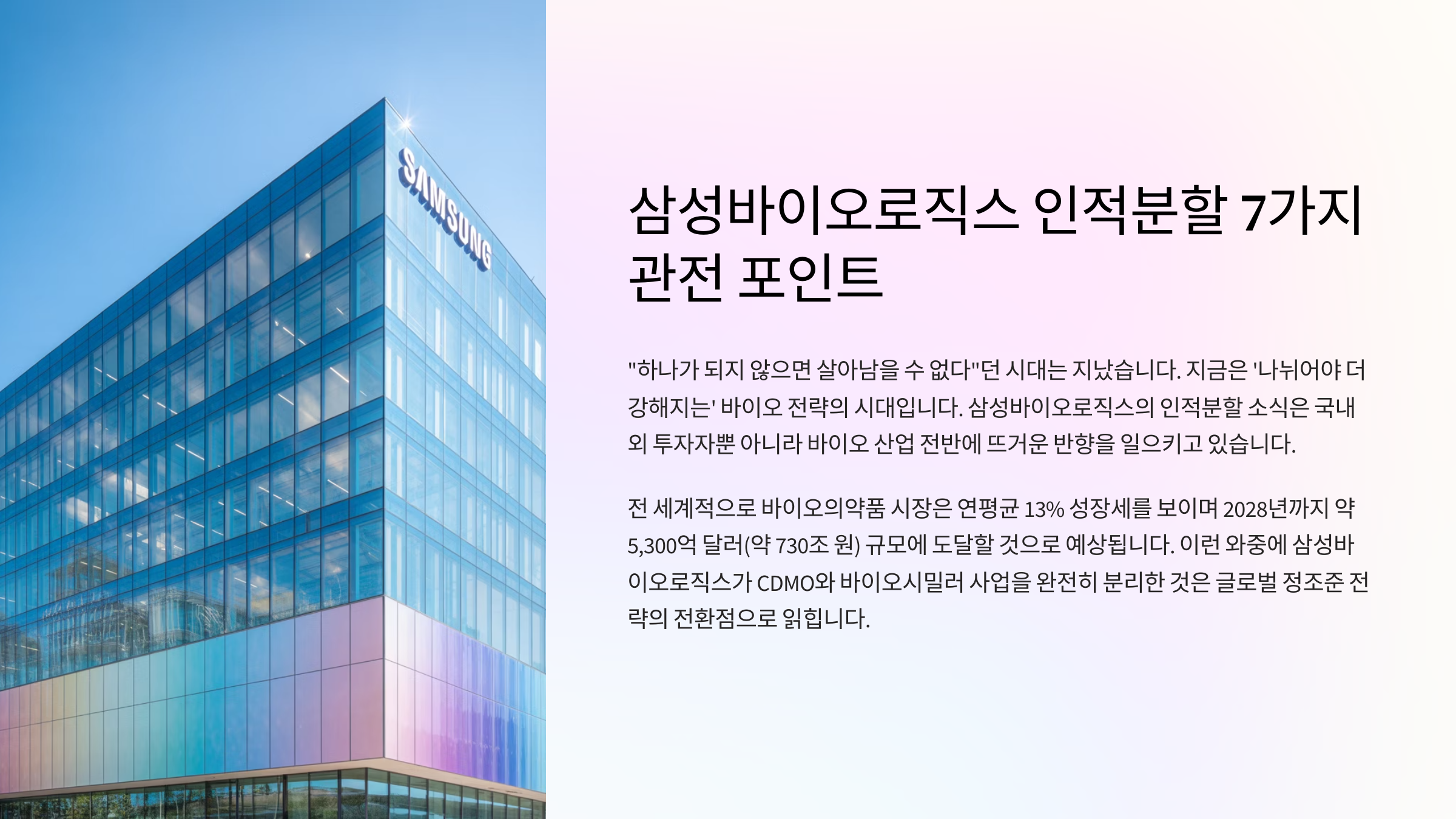 삼성바이오로직스의 인적분할은 단순한 조직개편이 아니라, 미래 바이오 산업의 판도를 바꾸는 전략적 결정이다. 이는 국내 바이오 산업이 글로벌 시장에서 살아남기 위한 필연적 선택이기도 하다.