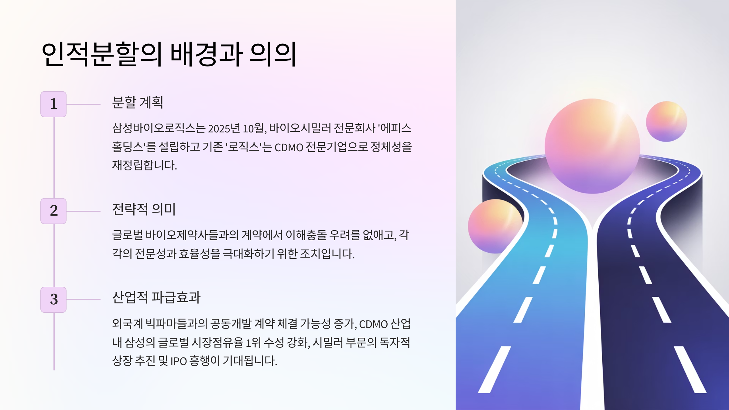 삼성바이오로직스는 2025년 10월, 바이오시밀러 전문회사 ‘에피스홀딩스’를 설립하고 기존 ‘로직스’는 CDMO 전문기업으로 정체성을 재정립한다. 이는 글로벌 바이오제약사들과의 계약에서 이해충돌 우려를 없애고, 각각의 전문성과 효율성을 극대화하기 위한 조치다.