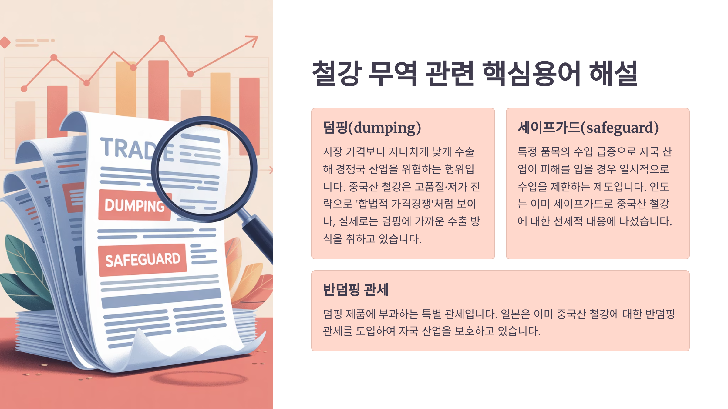 중국산 철강은 고품질·저가 전략으로 ‘합법적 가격경쟁’처럼 보이나, 실제로는 덤핑에 가까운 수출 방식입니다. 이에 대응해 일본은 반덤핑 관세를 도입했고, 인도는 세이프가드로 선제적 대응에 나섰습니다.