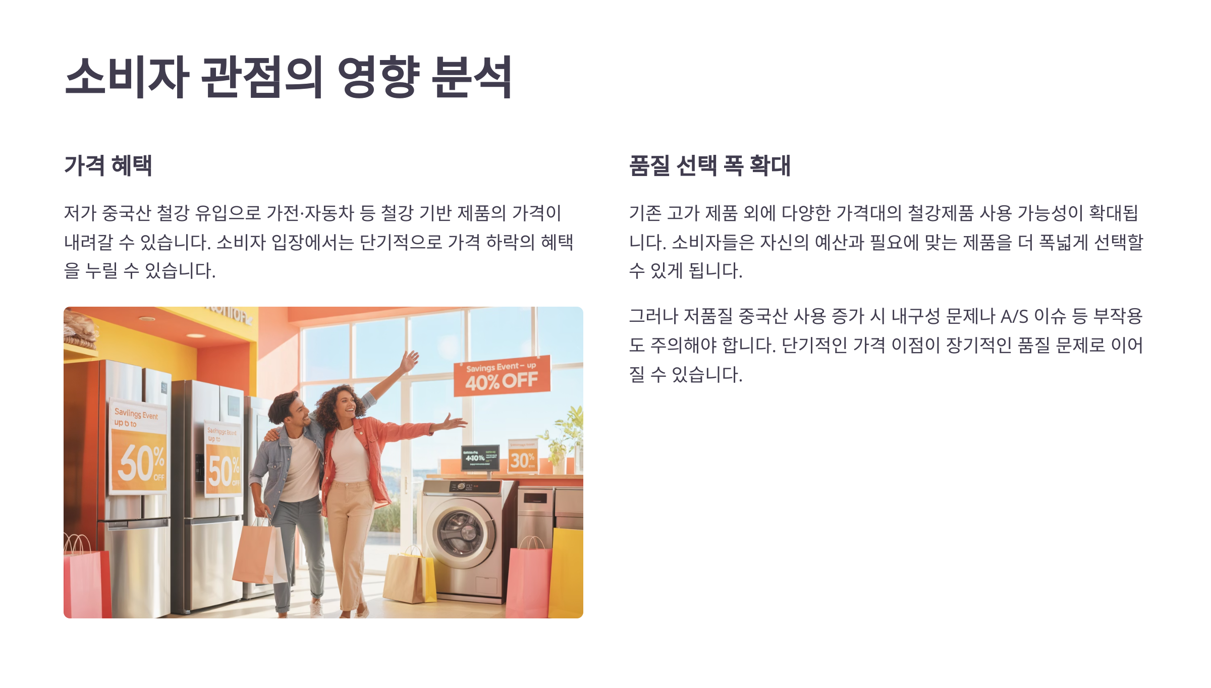 - 제품 가격 하락: 저가 중국산 유입으로 가전·자동차 등 철강 기반 제품의 가격이 내려갈 수 있음.