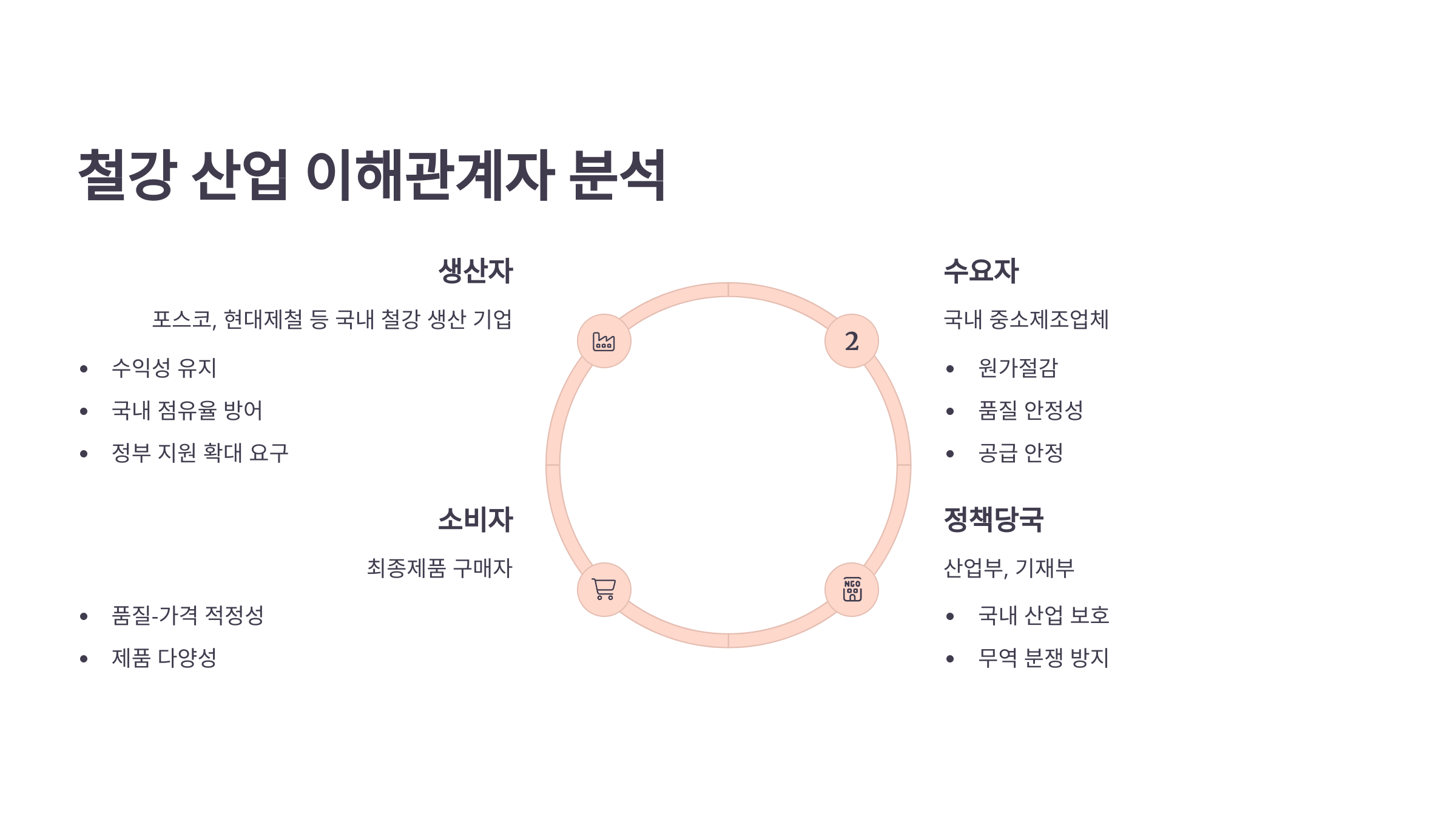 | 생산자 | 포스코, 현대제철 | 수익성, 국내 점유율 유지, 정부 지원 확대 |