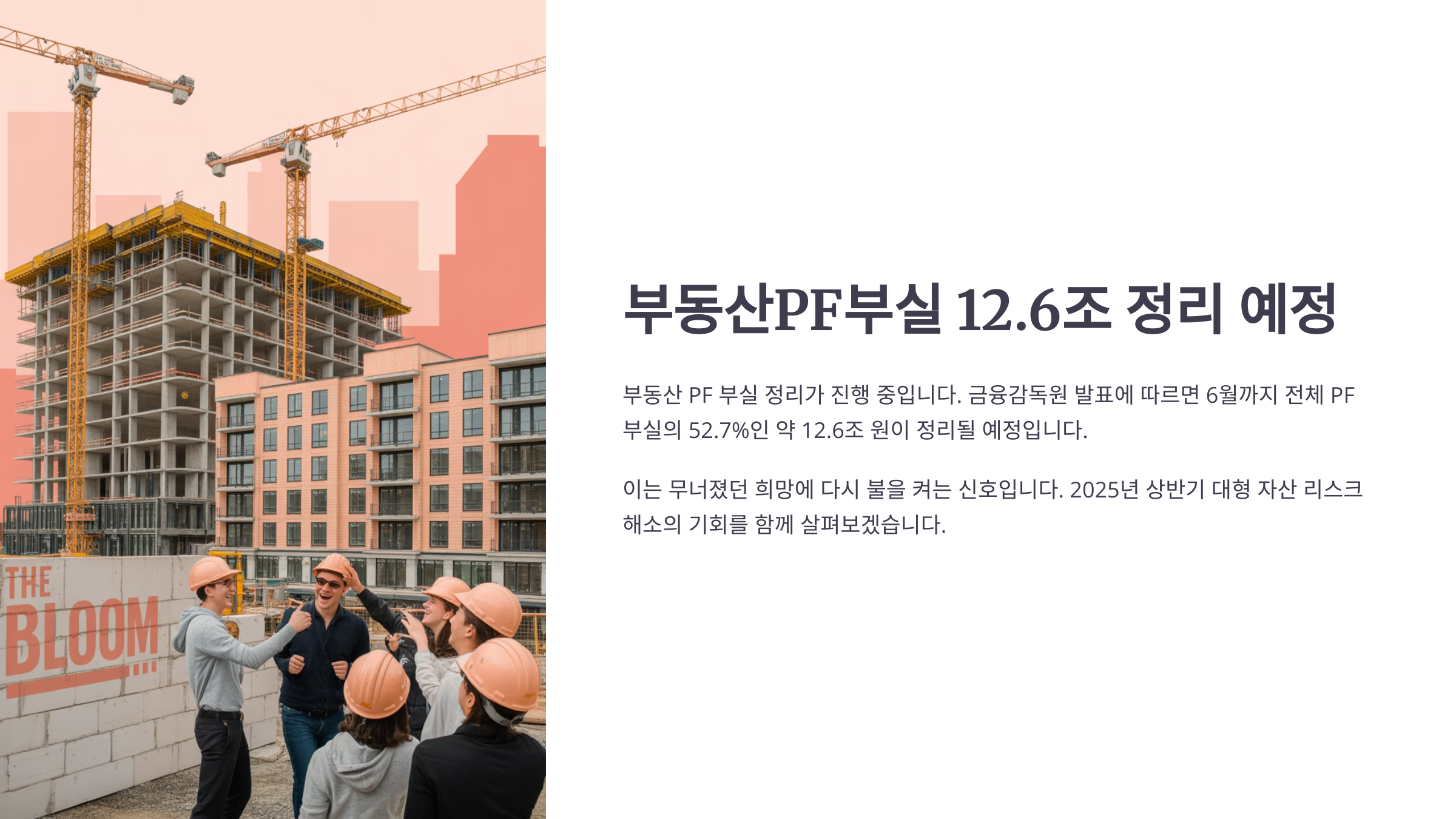 그런데 최근 금융감독원이 발표한 자료에 따르면, 오는 6월까지 전체 PF 부실의 52.7%에 달하는 약 12.6조 원이 정리될 예정이라고 합니다. 그리고 하반기에도 정리는 계속될 거라고 밝혔습니다. 무너졌던 희망에 다시 불이 켜졌습니다.