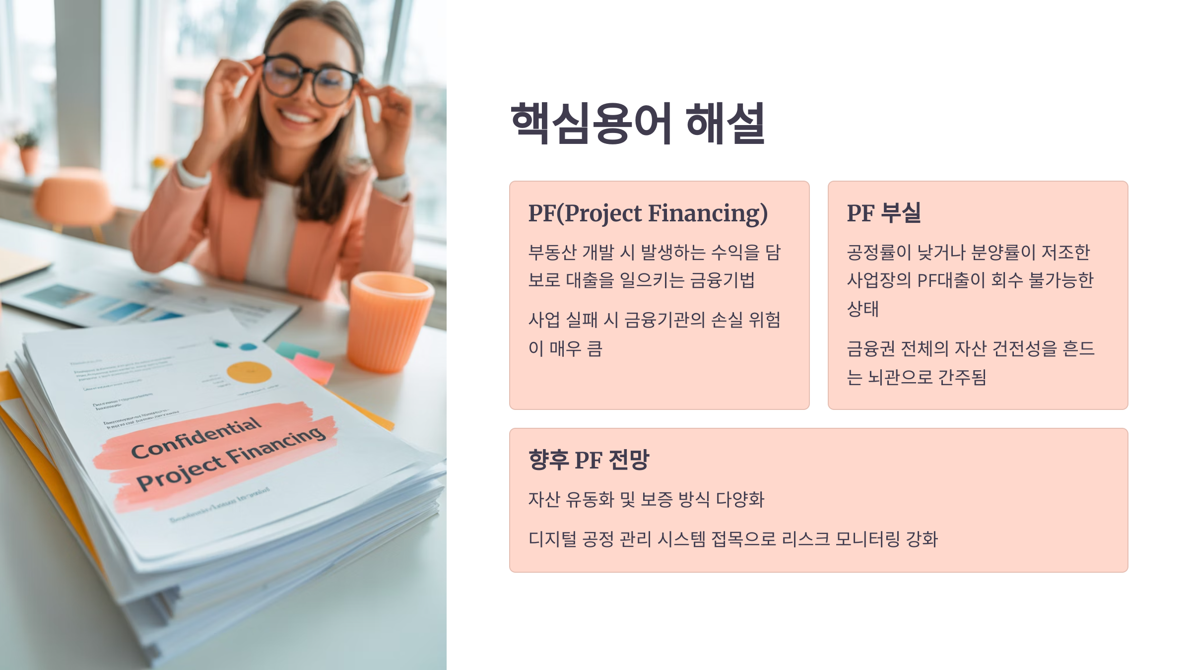 최근 주목받는 단어는 “PF 부실”로, 공정률이 낮거나 분양률이 저조한 사업장의 PF대출이 회수가 불가능한 상태를 의미합니다. 이는 금융권 전체의 자산 건전성을 흔드는 뇌관으로 간주되어 왔습니다.