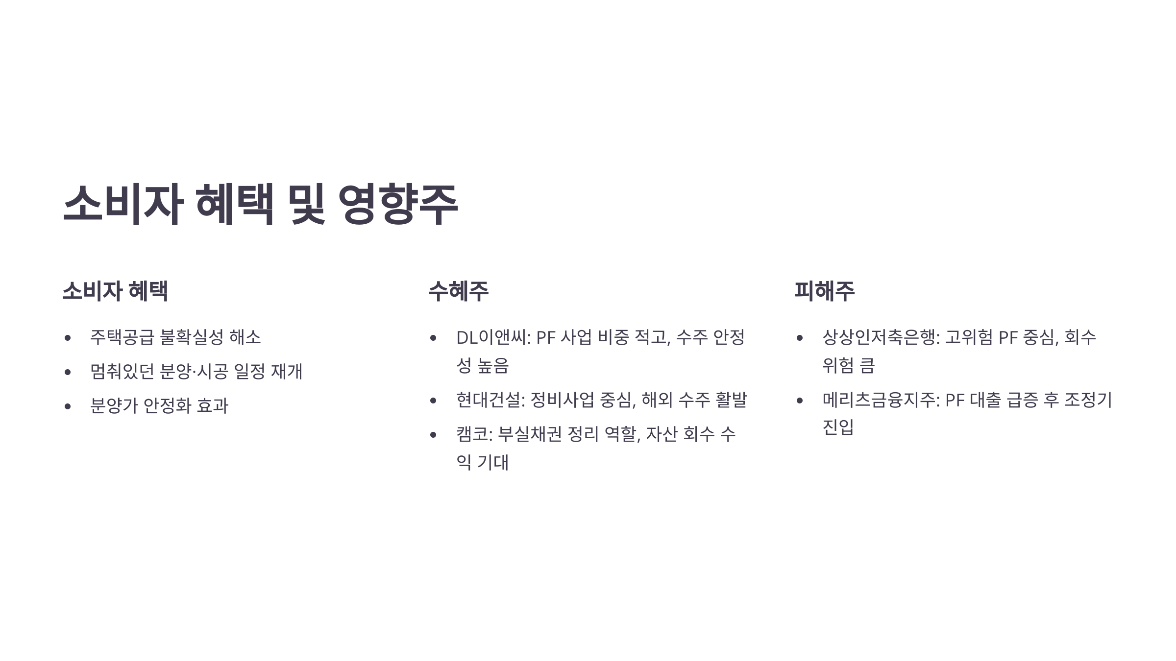 | 소비자 | 주거 안정, 분양 신뢰성 | 시장 반응 | 분양 연기, 시공 불량 |