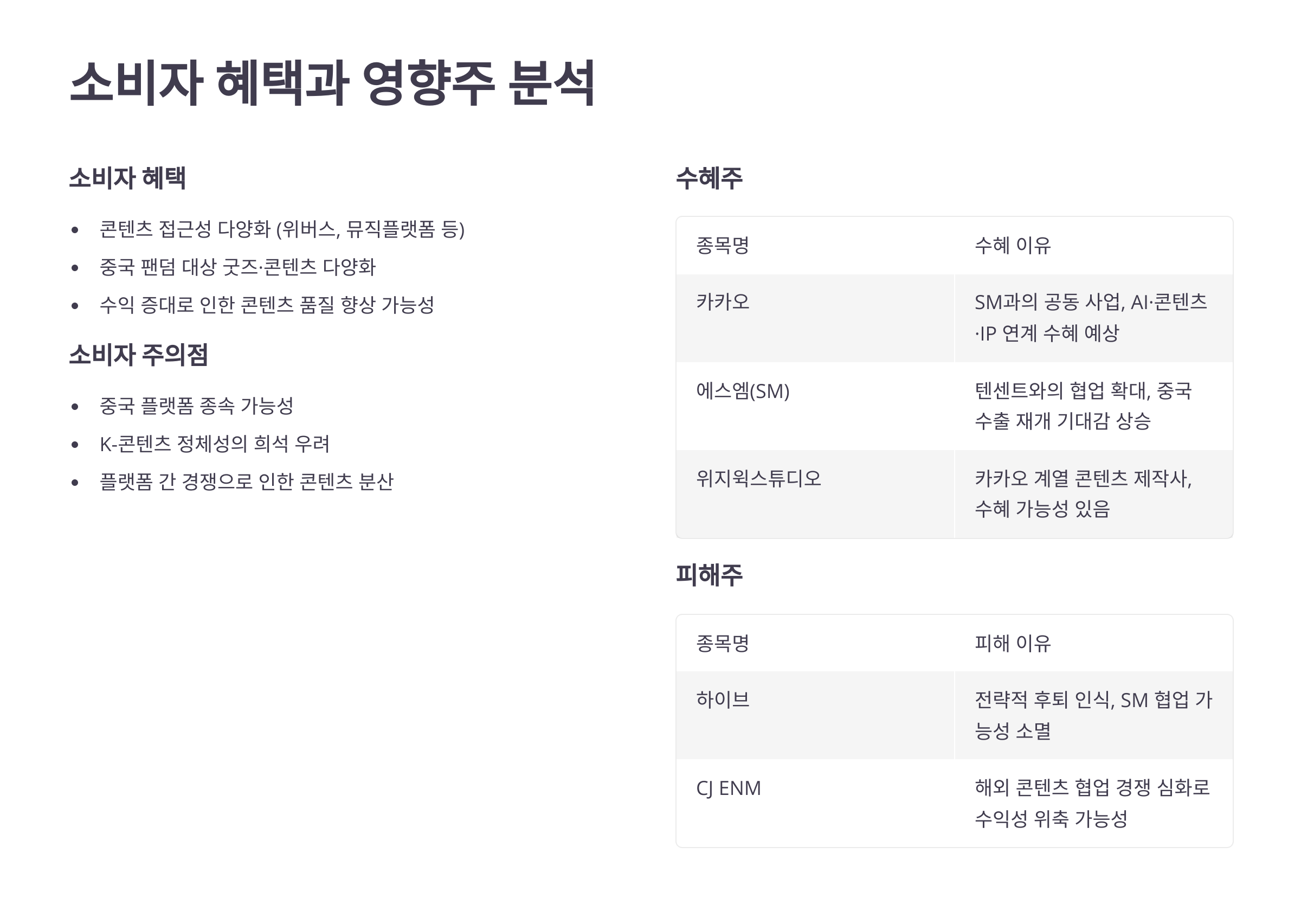 텐센트는 중국 내 유통, 스트리밍, 굿즈 유통망을 갖고 있고, 한국 엔터 기업들은 이를 통해 중국 내 팬덤 회복과 수익 재확보가 가능해집니다. 그러나, 반대로 콘텐츠 주권이 점차 해외로 넘어간다는 우려도 존재합니다.