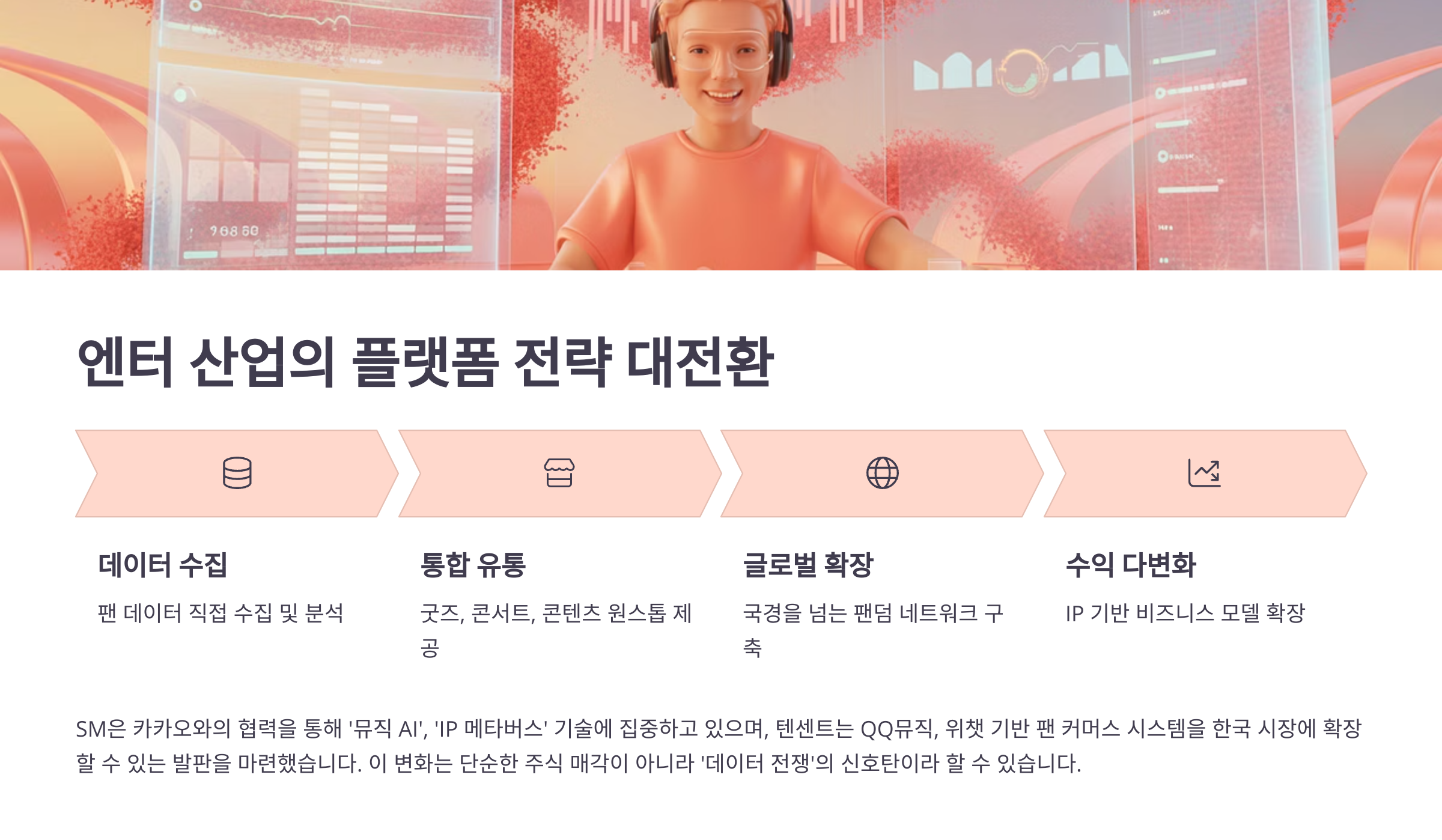 반면 SM은 카카오와의 협력을 통해 '뮤직 AI', 'IP 메타버스' 기술에 집중하고 있으며, 텐센트는 QQ뮤직, 위챗 기반 팬 커머스 시스템을 한국 시장에 확장할 수 있는 발판을 마련한 셈입니다.