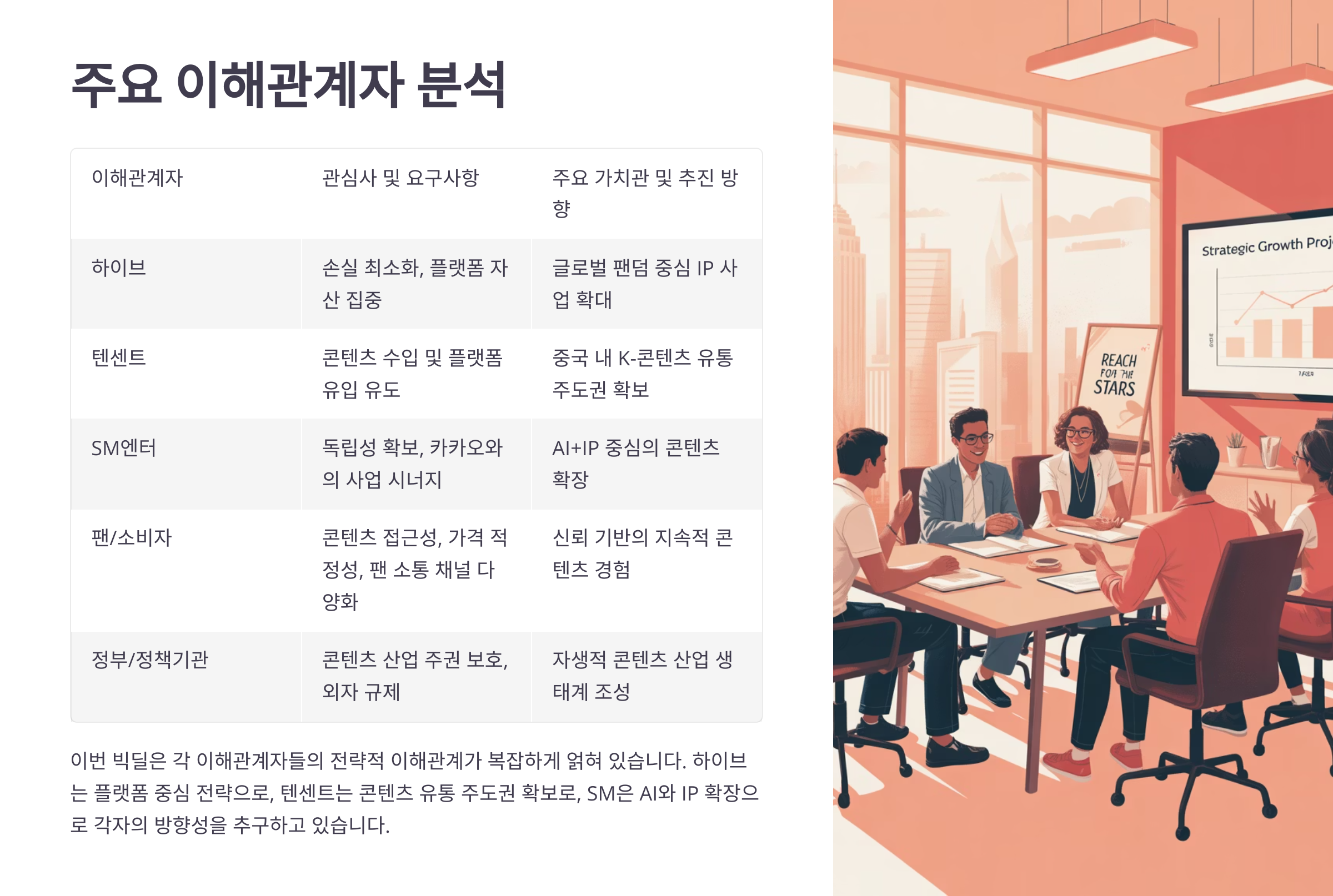| SM엔터 | 독립성 확보, 카카오와의 사업 시너지 | AI+IP 중심의 콘텐츠 확장 |