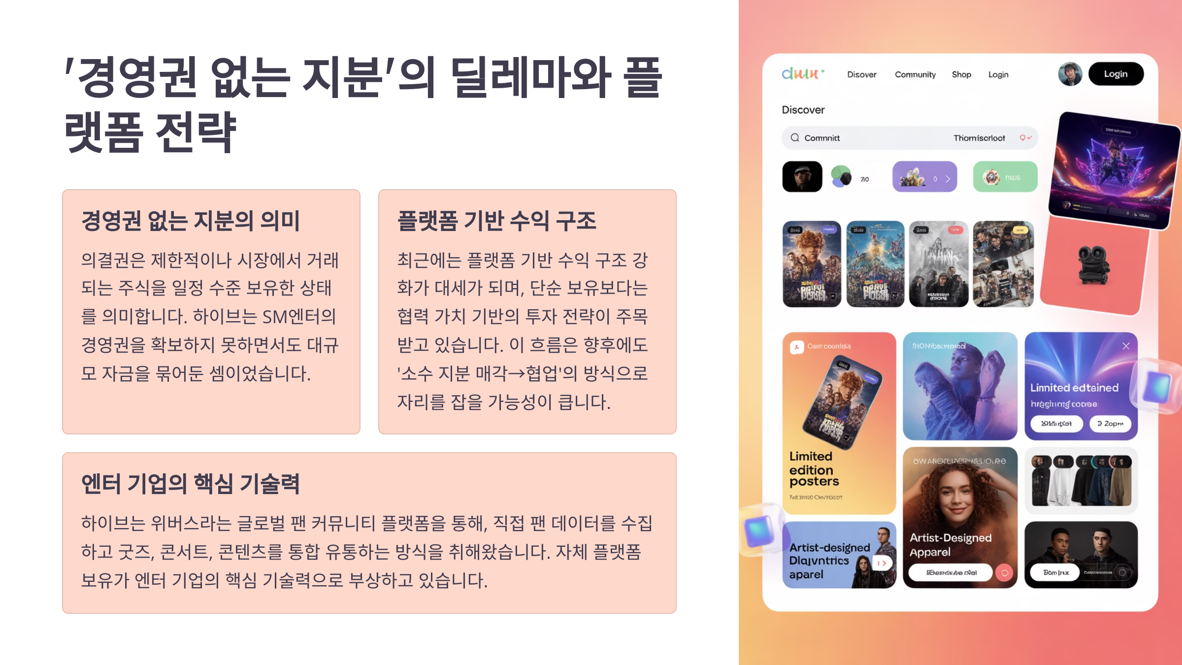 하이브는 위버스라는 글로벌 팬 커뮤니티 플랫폼을 통해, 직접 팬 데이터를 수집하고 굿즈, 콘서트, 콘텐츠를 통합 유통하는 방식을 취해왔습니다. 이처럼 자체 플랫폼 보유가 엔터 기업의 핵심 기술력으로 부상하고 있습니다.
