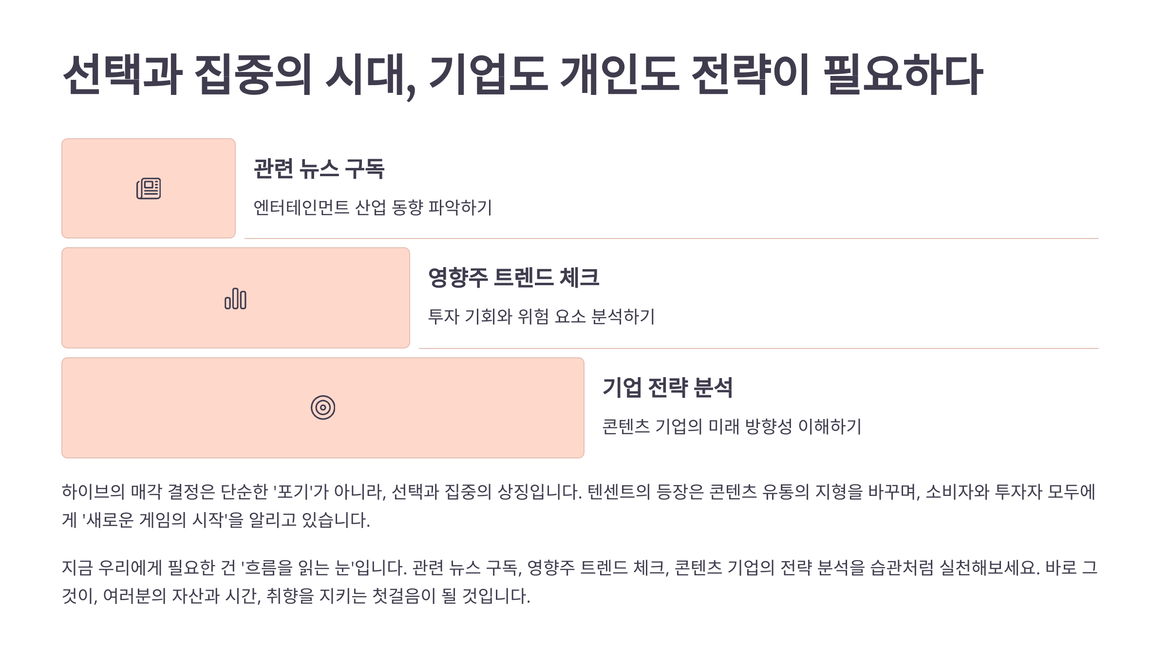 하이브의 매각 결정은 단순한 ‘포기’가 아니라, 선택과 집중의 상징입니다.