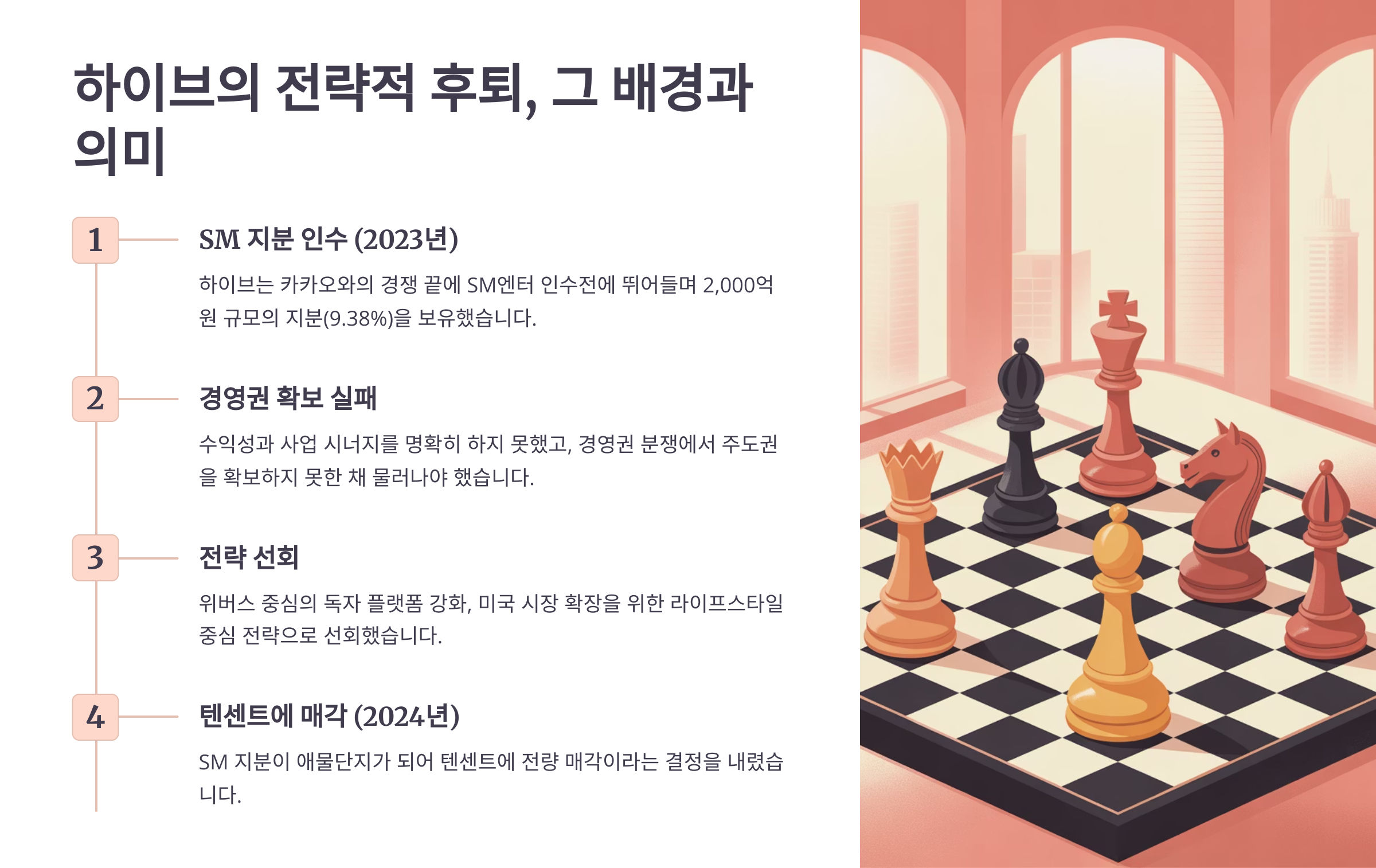하이브는 2023년부터 카카오와의 경쟁 끝에 SM엔터 인수전에 뛰어들며 2,000억 원 규모의 지분(9.38%)을 보유했습니다. 하지만 수익성과 사업 시너지를 명확히 하지 못했고, 경영권 분쟁에서 주도권을 확보하지 못한 채 물러나야 했습니다.
