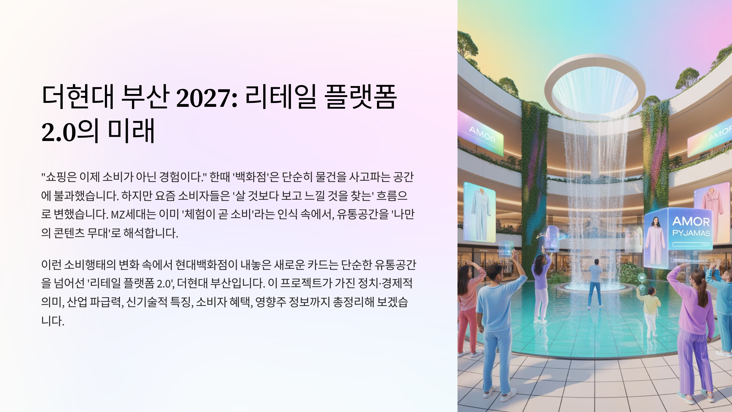 '더현대 부산'은 단순한 백화점이 아닙니다. 기술, 경험, 데이터, 지역경제를 융합한 미래형 리테일 플랫폼입니다. 변화의 흐름 속에서 우리는 더 이상 소비자가 아닌 공간의 주인공이 되어야 합니다.