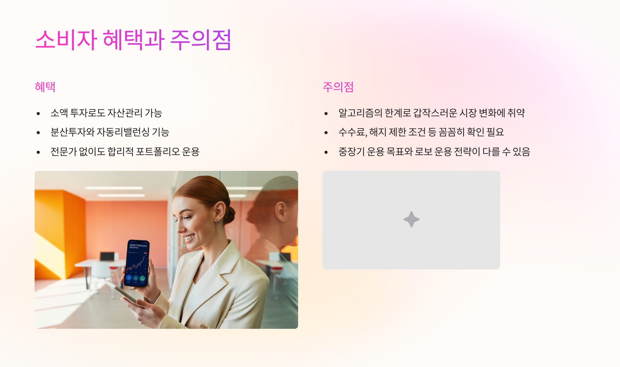 이 기술은 기존의 펀드매니저나 자산관리사의 역할을 AI가 대신하는 것이며, 투자 비용이 저렴하고 접근성이 좋다는 장점이 있다. 하지만 시장 급변 시 인간의 직관이 없는 ‘기계적 매매’의 위험성이 문제로 떠오른다.