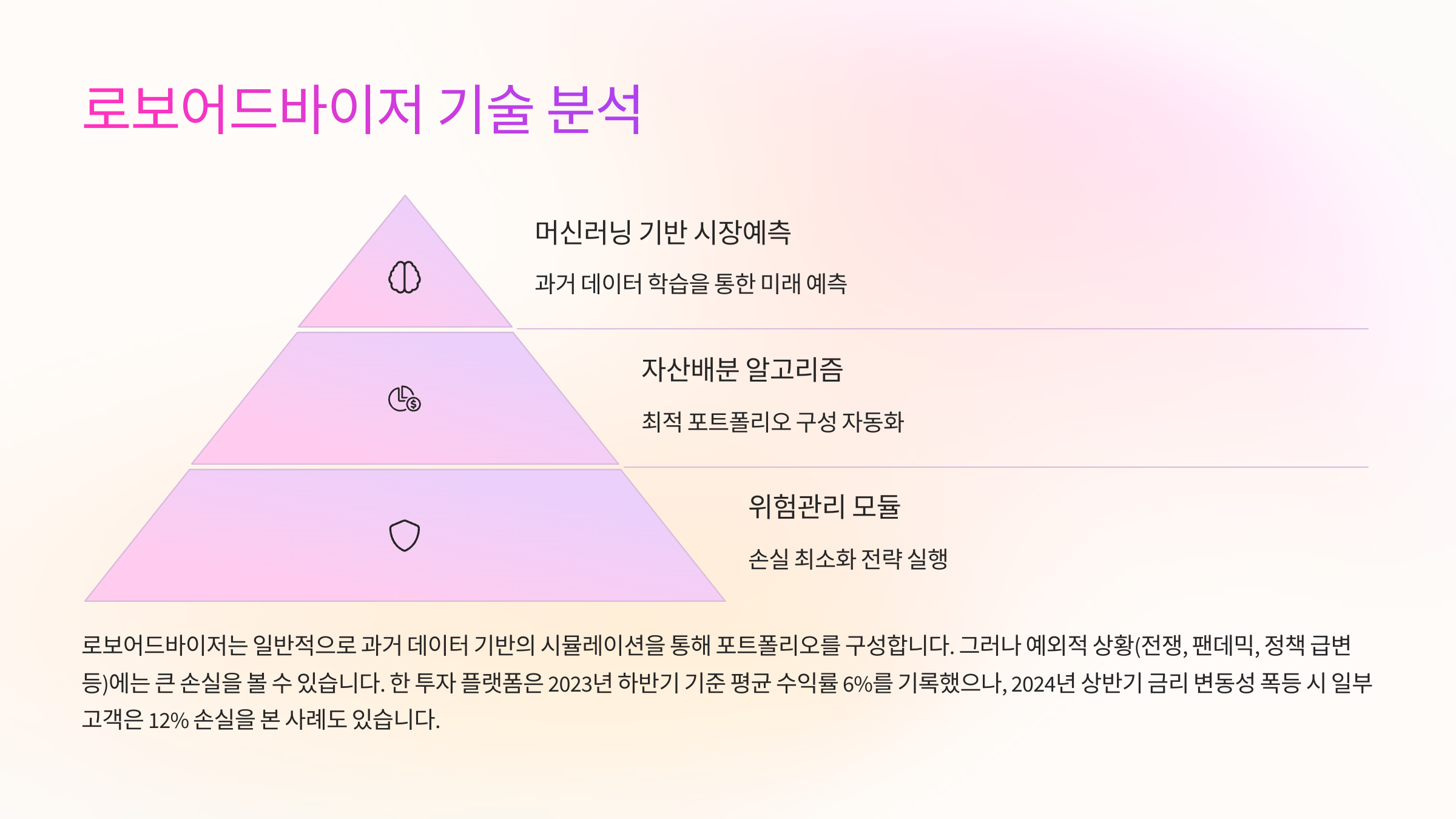 로보어드바이저는 머신러닝 기반의 시장예측 모델, 자산배분 알고리즘, 위험관리 모듈로 구성된다. 일반적으로 과거 데이터 기반의 시뮬레이션을 통해 포트폴리오를 구성하지만, 예외적 상황(전쟁, 팬데믹, 정책 급변 등)에는 큰 손실을 볼 수 있다.