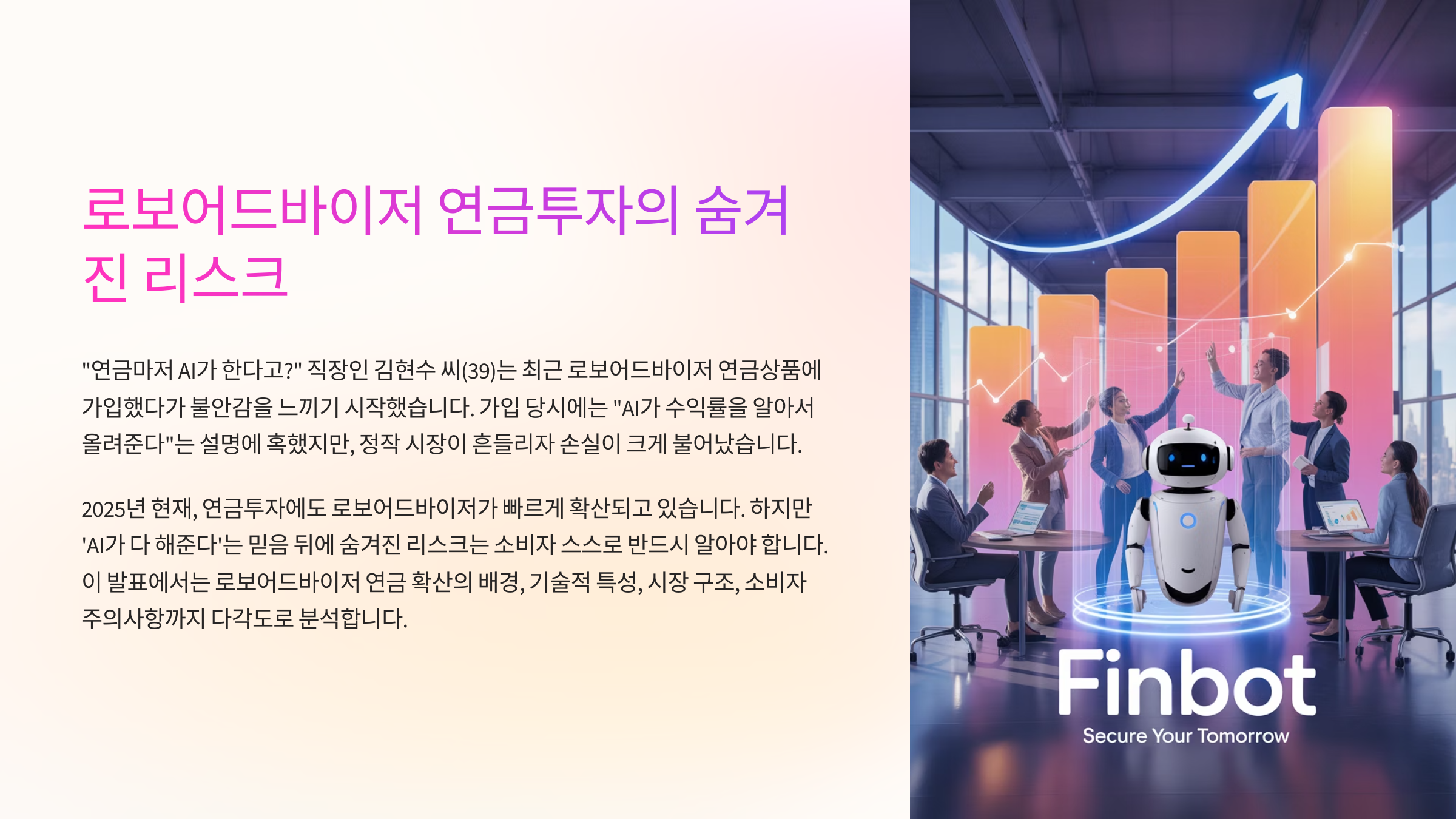 로보어드바이저는 이제 단순 투자상품을 넘어 연금시장까지 빠르게 확대되고 있습니다. 하지만 ‘AI가 다 해준다’는 마케팅 문구 이면에는 소비자가 반드시 알아야 할 리스크가 도사리고 있습니다.