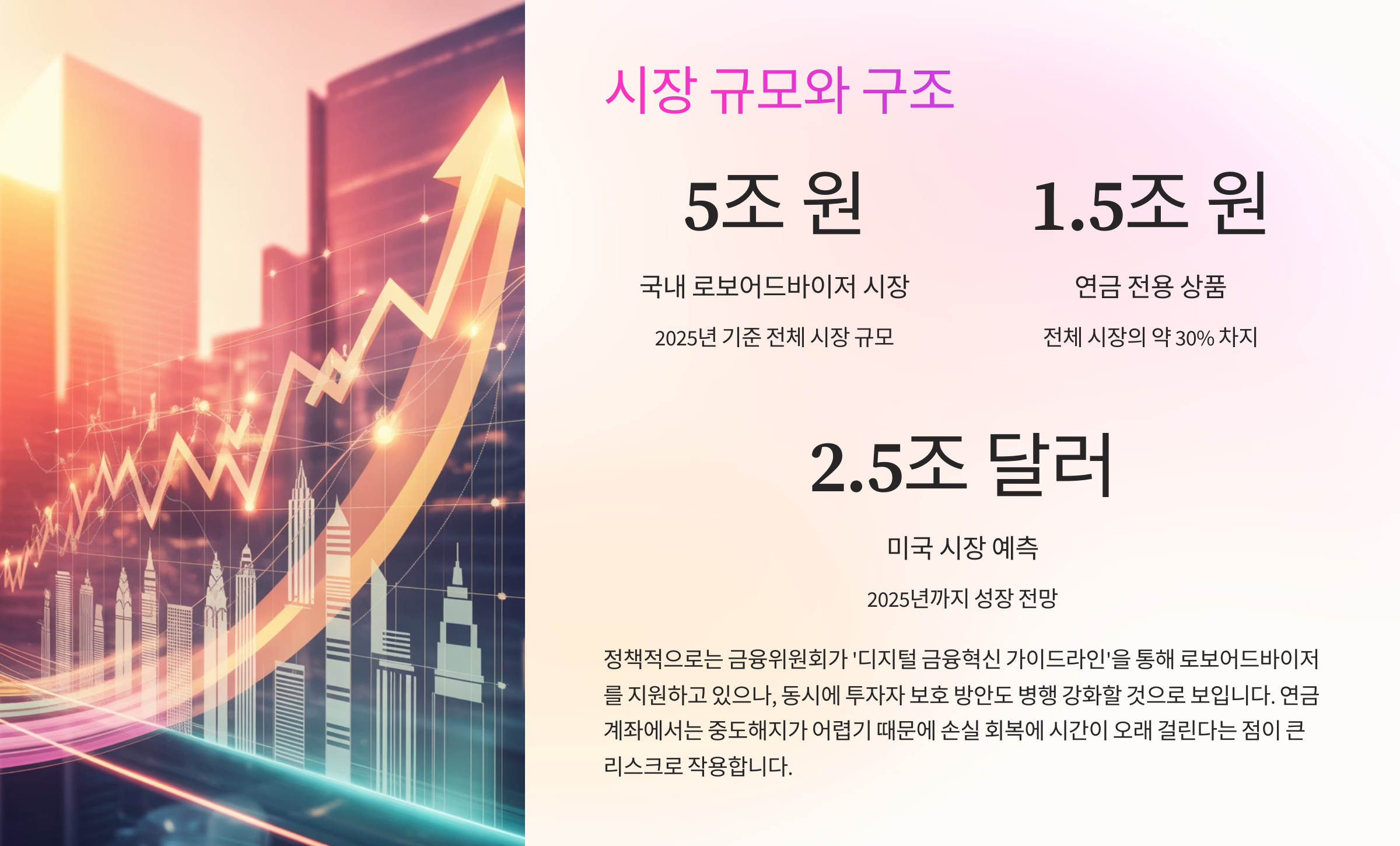 - 국내 로보어드바이저 시장 규모는 2025년 기준 약 5조 원, 이 중 연금 전용 상품은 약 1조 5천억 원 수준이다.