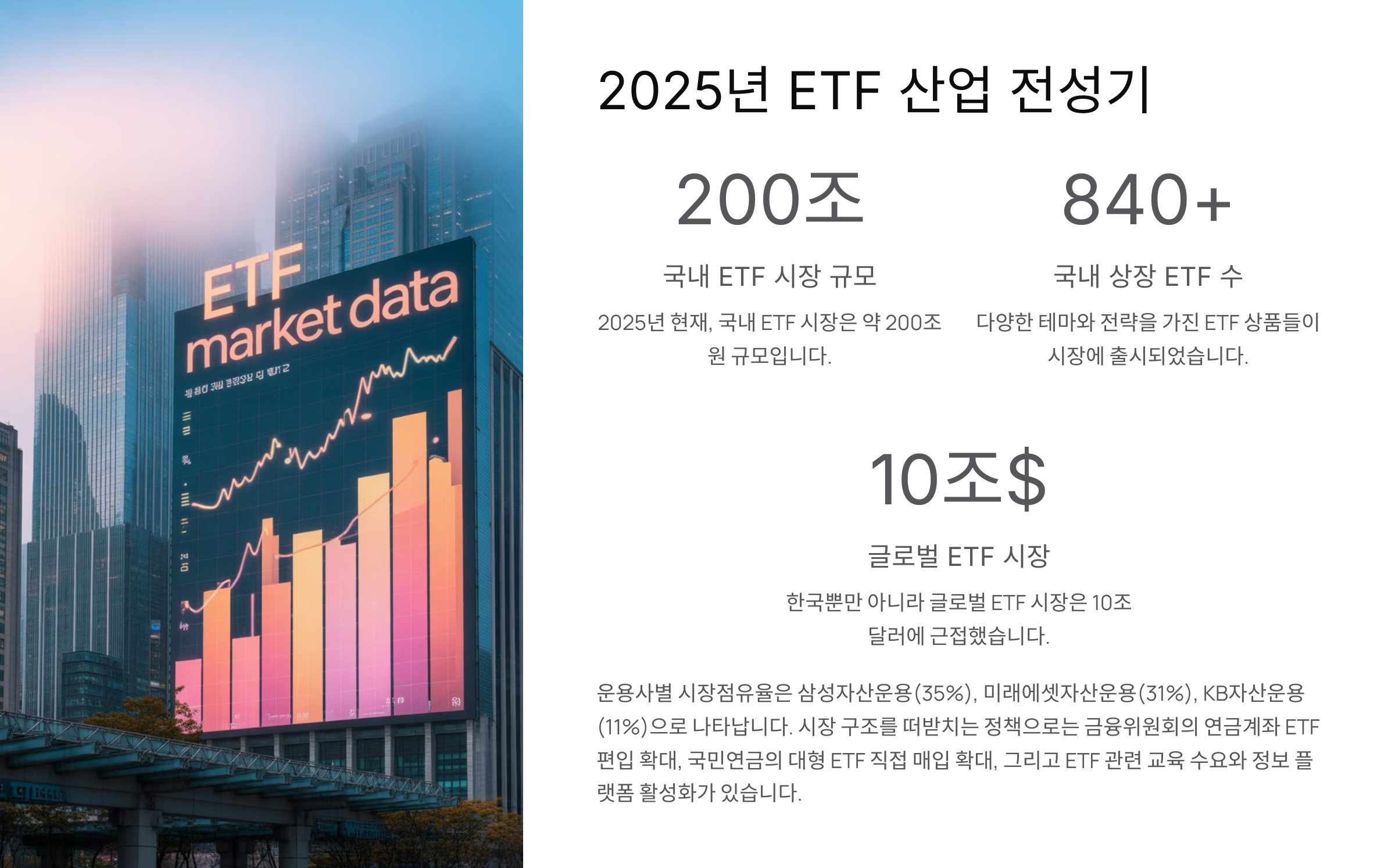 2025년 현재, 국내 ETF 시장은 약 200조 원 규모입니다. 한국뿐만 아니라 글로벌 ETF 시장은 10조 달러에 근접했죠.