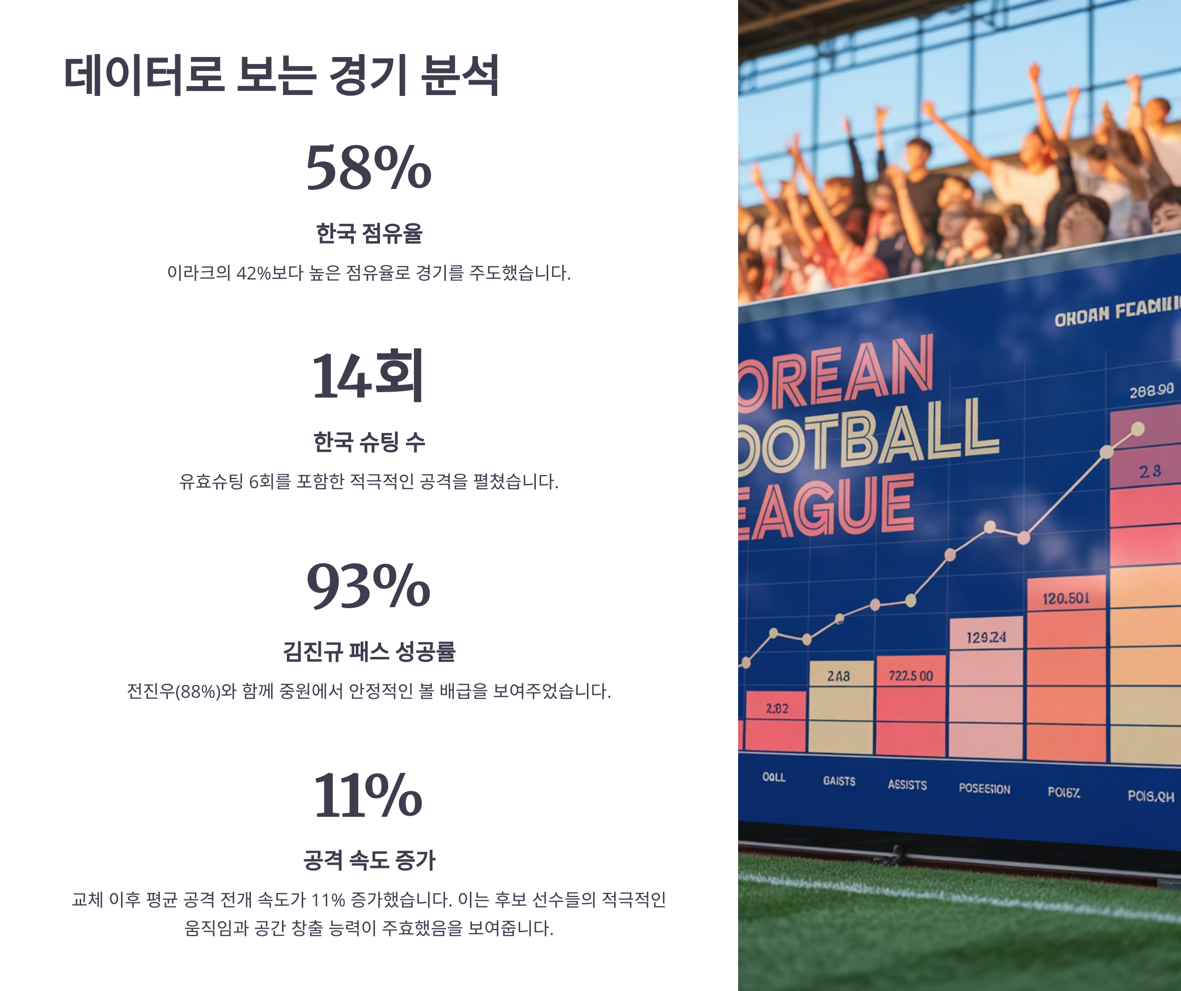 특히 주목할 만한 점은 교체 이후 평균 공격 전개 속도가 11% 증가했다는 것. 이는 후보 선수들의 적극적인 움직임과 공간 창출 능력이 주효했음을 보여줍니다.