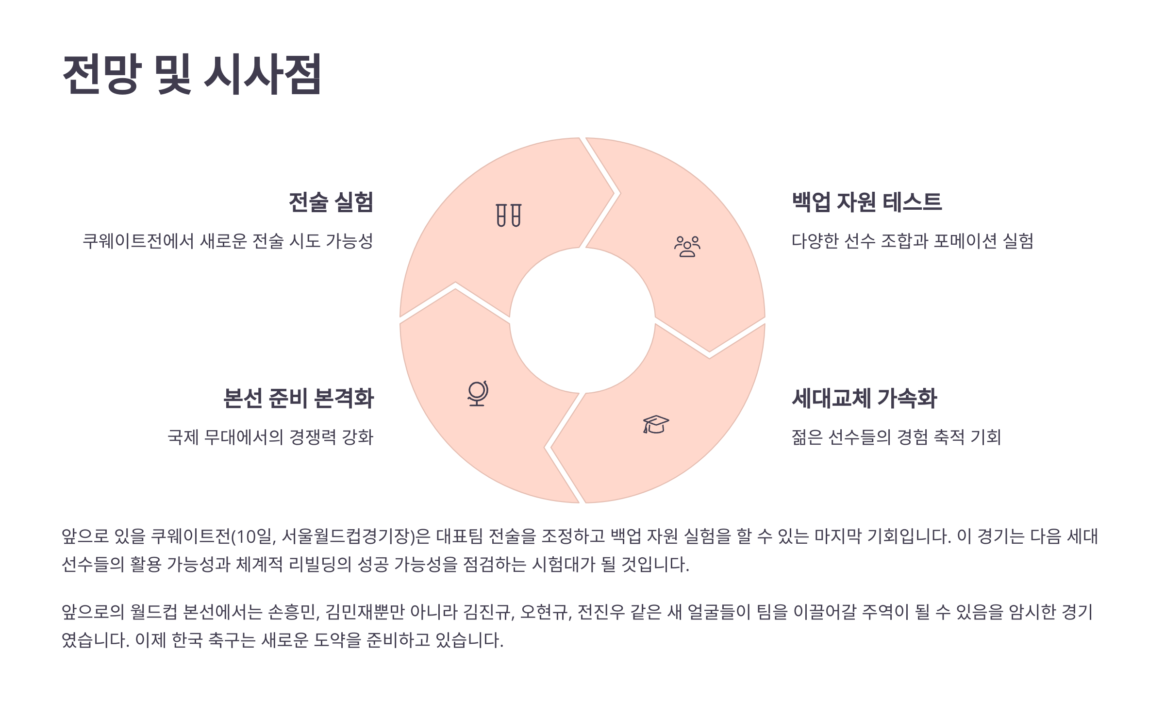 앞으로의 월드컵 본선에서는 손흥민, 김민재뿐만 아니라 김진규, 오현규, 전진우 같은 새 얼굴들이 팀을 이끌어갈 주역이 될 수 있음을 암시한 경기였습니다.