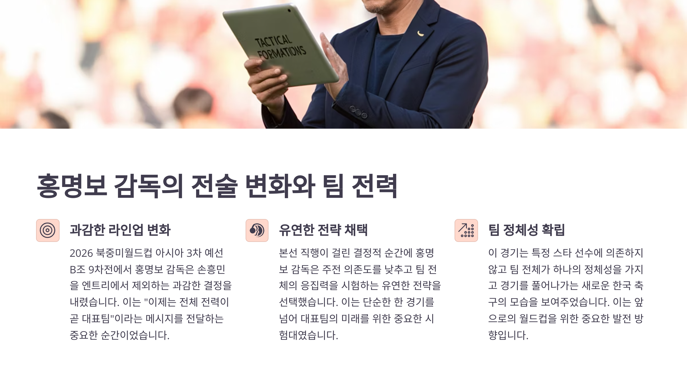 홍명보 감독의 전술 변화, 손흥민 제외에도 흔들리지 않은 전력