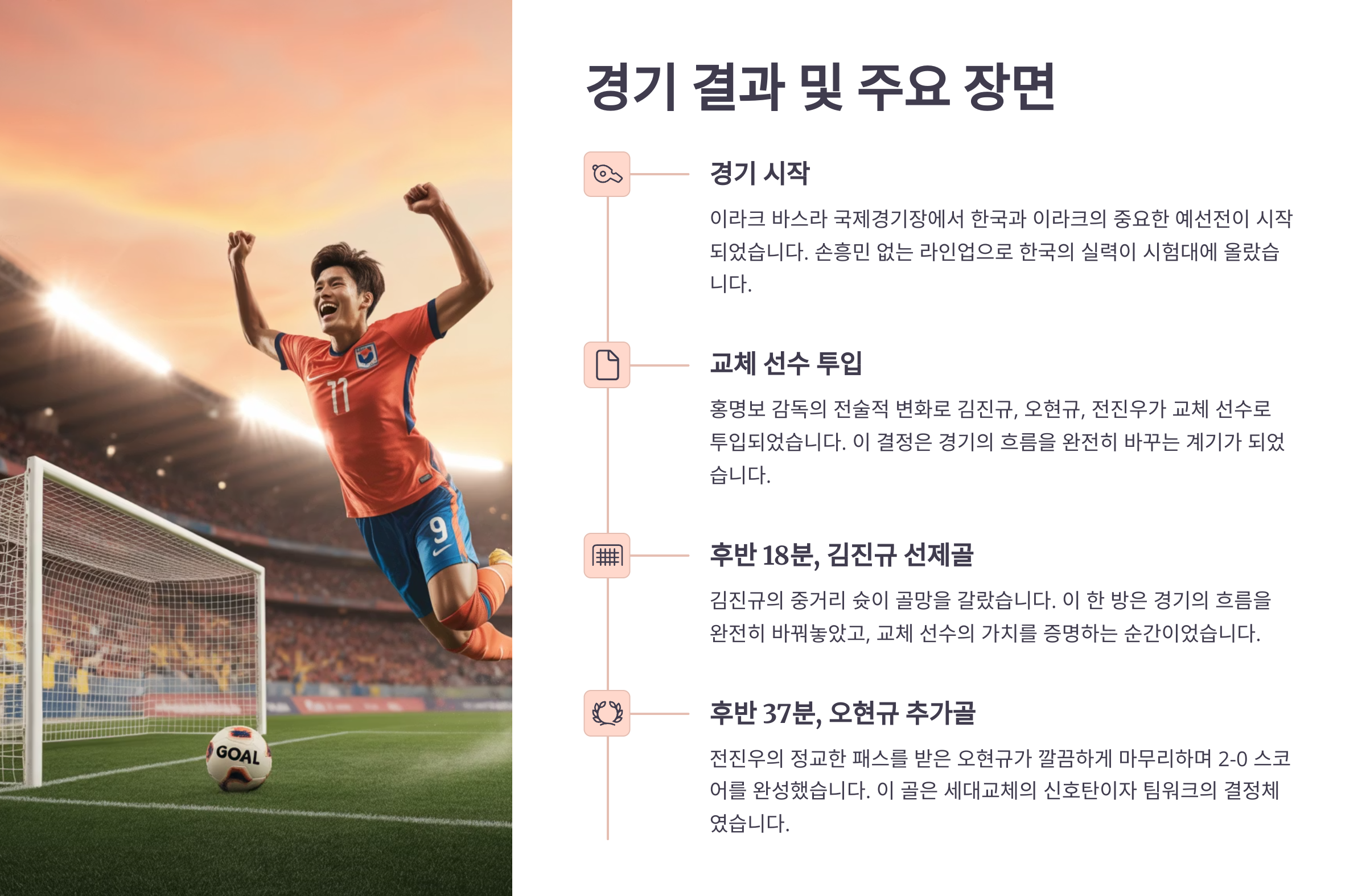 특히 김진규, 오현규, 전진우라는 ‘교체선수 3인방’이 어떻게 경기를 바꾸었고, 어떤 의미를 지녔는지에 집중하며, 축구 팬으로서 이 경기에서 어떤 통찰을 얻을 수 있을지 함께 고민해봅니다.