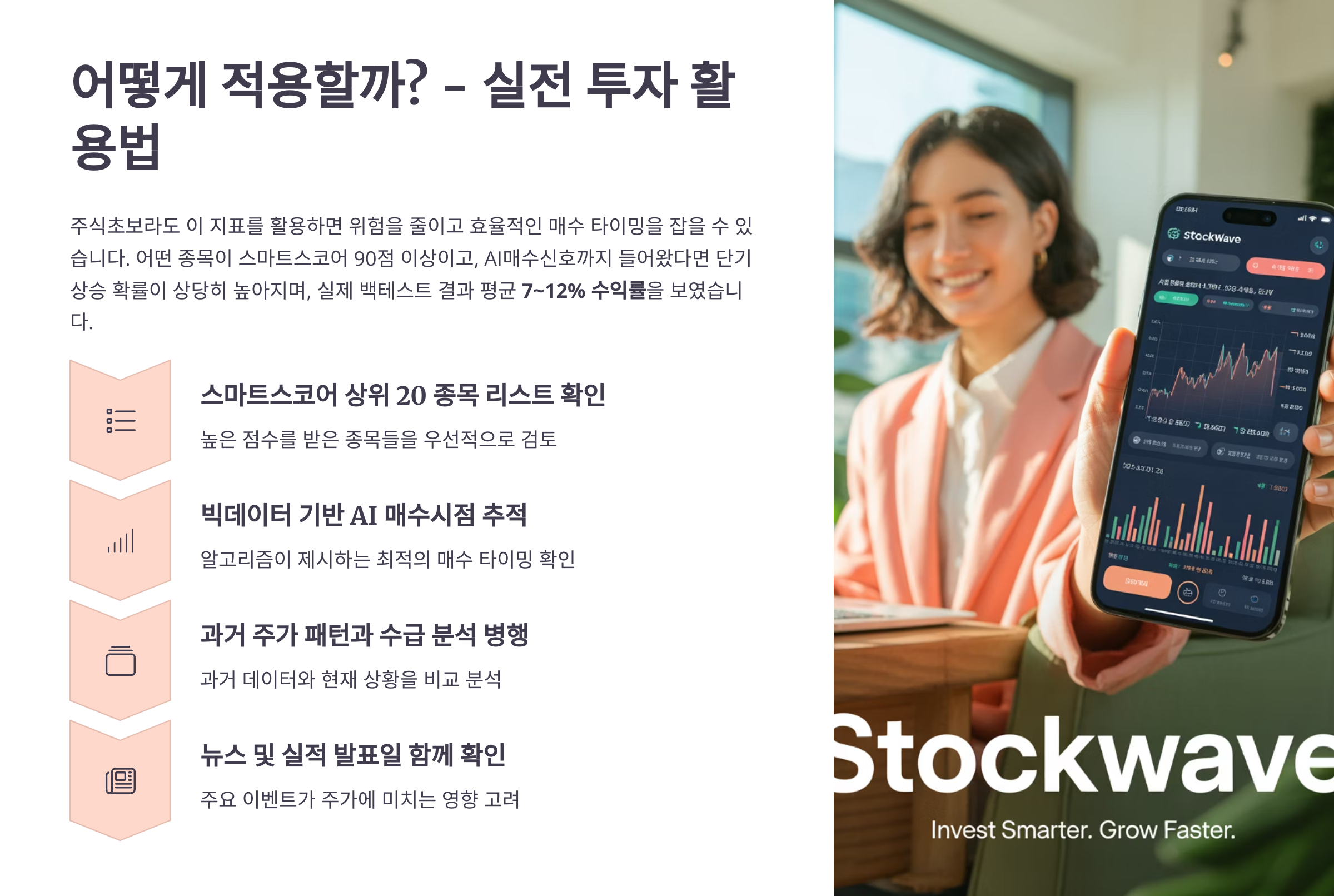 예를 들어, 어떤 종목이 스마트스코어 90점 이상이고, AI매수신호까지 들어왔다면 단기 상승 확률이 상당히 높아지며, 실제 백테스트 결과 평균 7~12% 수익률을 보였습니다.