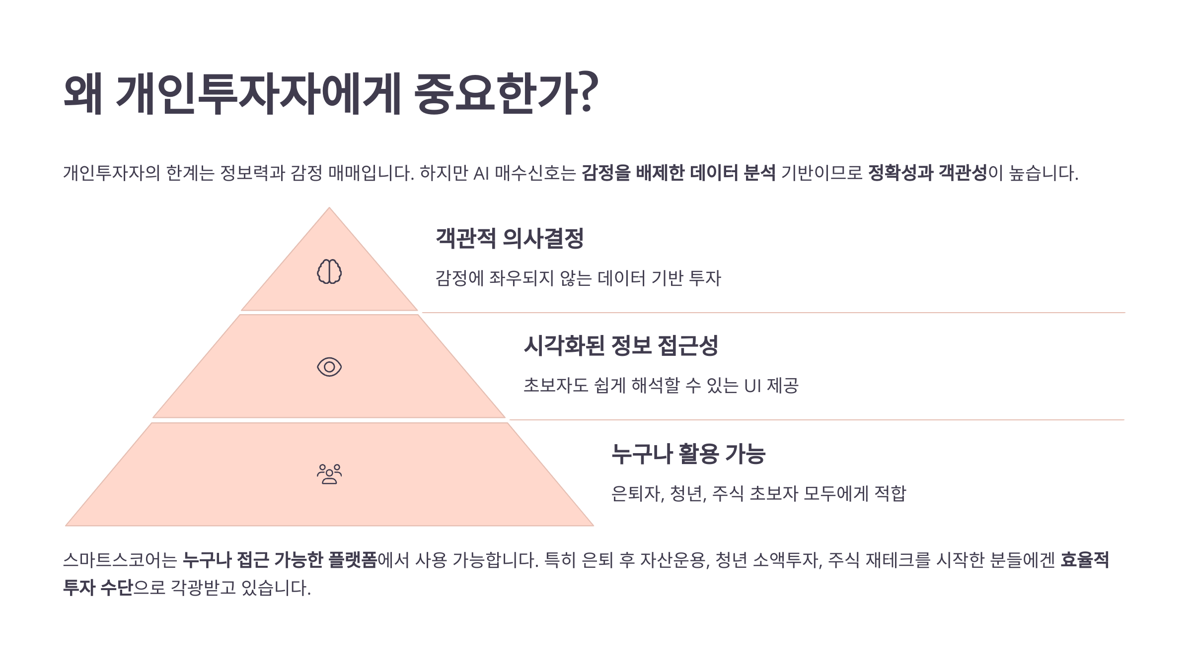 또한, 스마트스코어는 초보자도 쉽게 해석할 수 있는 시각화 UI를 제공하며, 누구나 접근 가능한 플랫폼에서 사용 가능합니다.