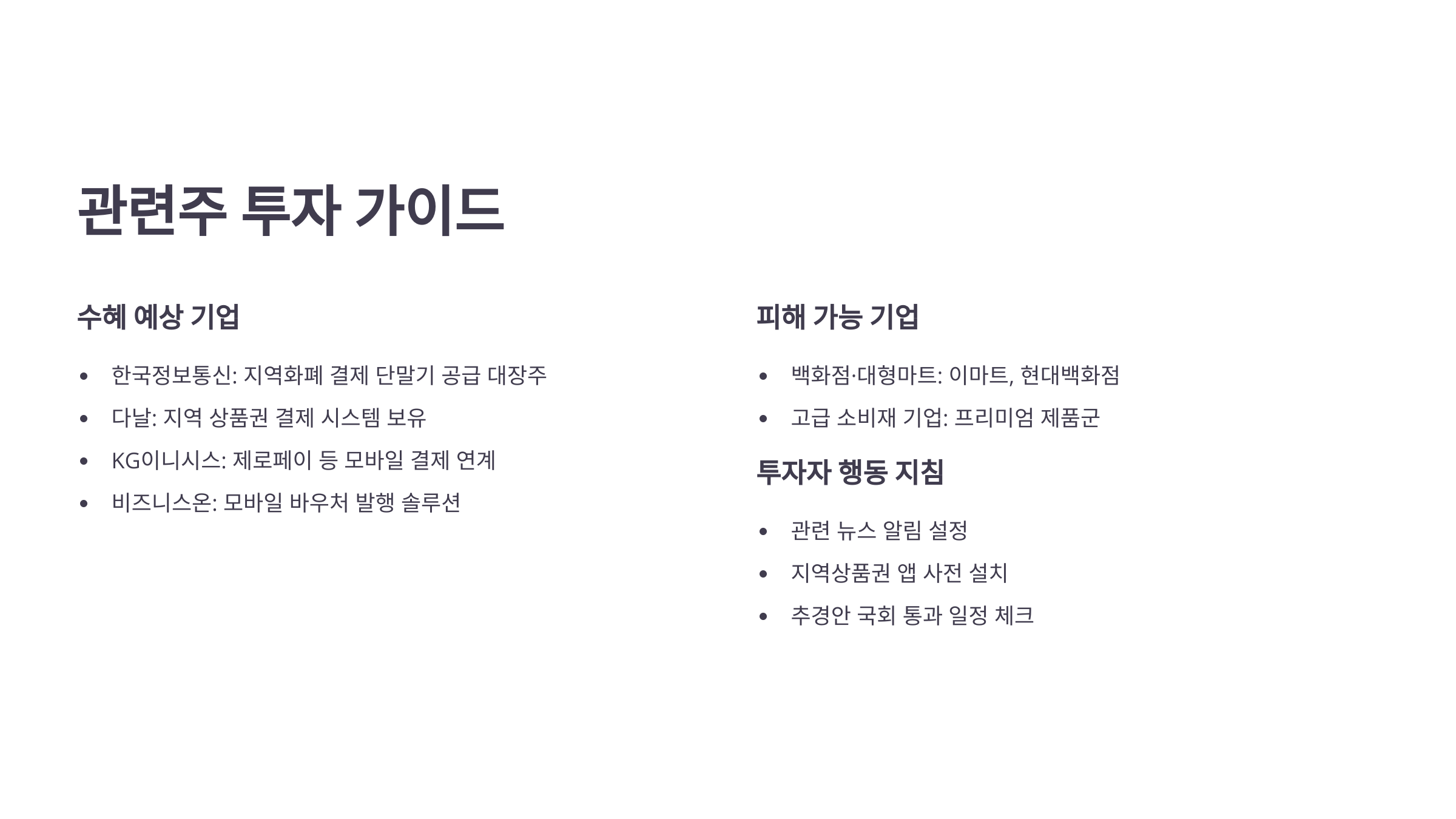 - 백화점·대형마트 관련주(이마트, 현대백화점): 지역화폐 사용 제한 업종