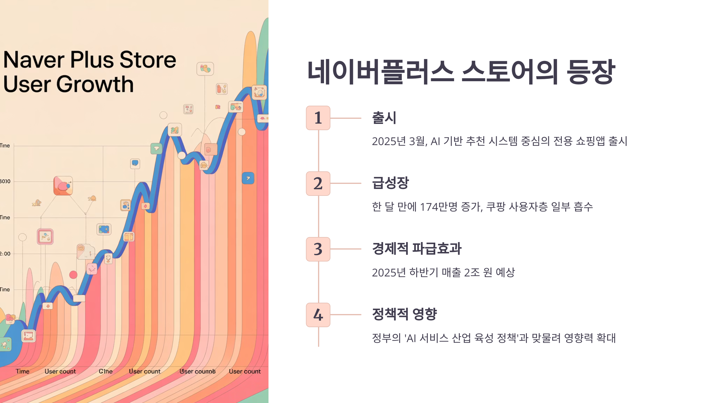 - 경제적 파급효과: 2025년 하반기 매출 2조 원 예상. 광고·결제·물류 시스템이 통합되면서 네이버 쇼핑 생태계 전체에 대규모 수익 파이프라인 형성.