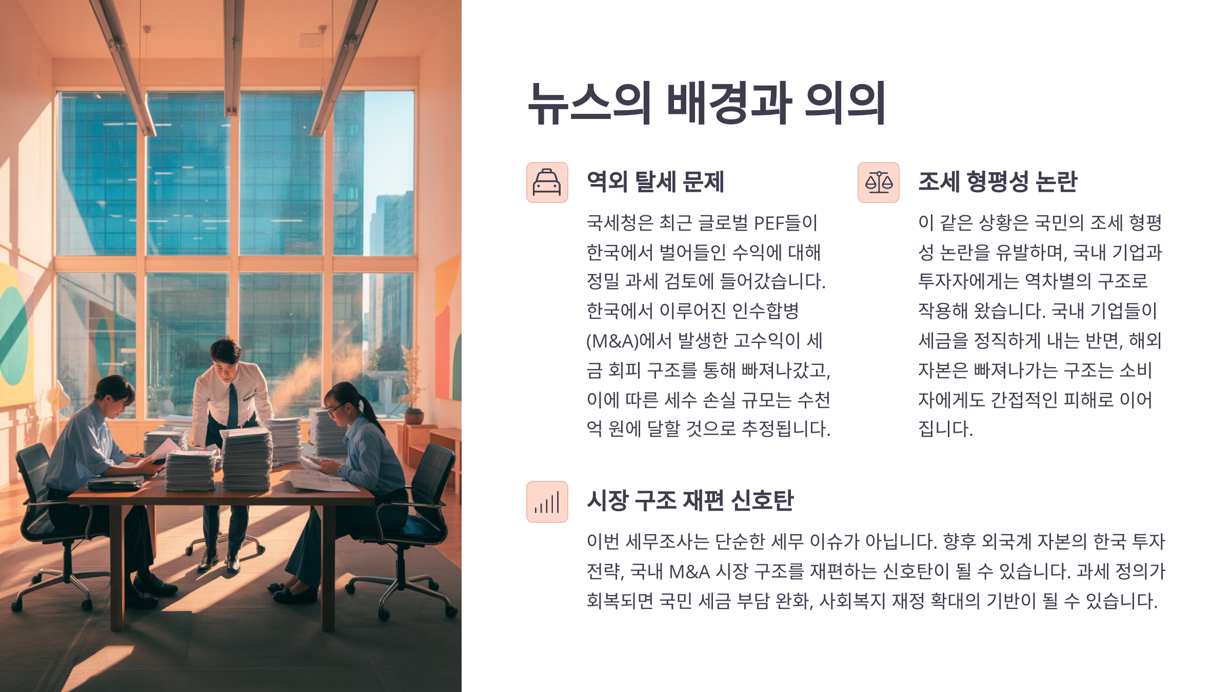 이번 세무조사는 단순한 세무 이슈가 아닙니다. 향후 외국계 자본의 한국 투자 전략, 국내 M&A 시장 구조를 재편하는 신호탄이 될 수 있습니다.