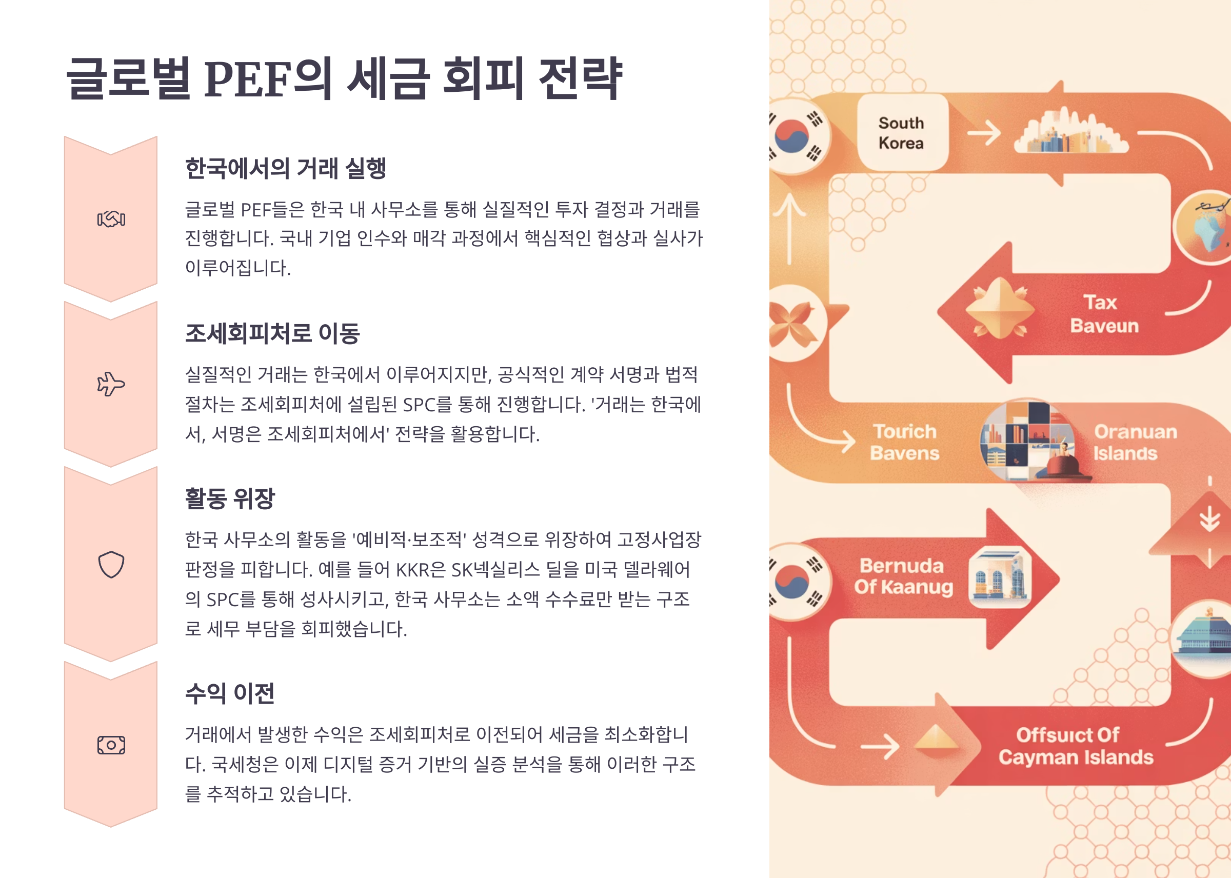 글로벌 PEF들은 최근까지도 ‘거래는 한국에서, 서명은 조세회피처에서’라는 전략을 사용해왔습니다.