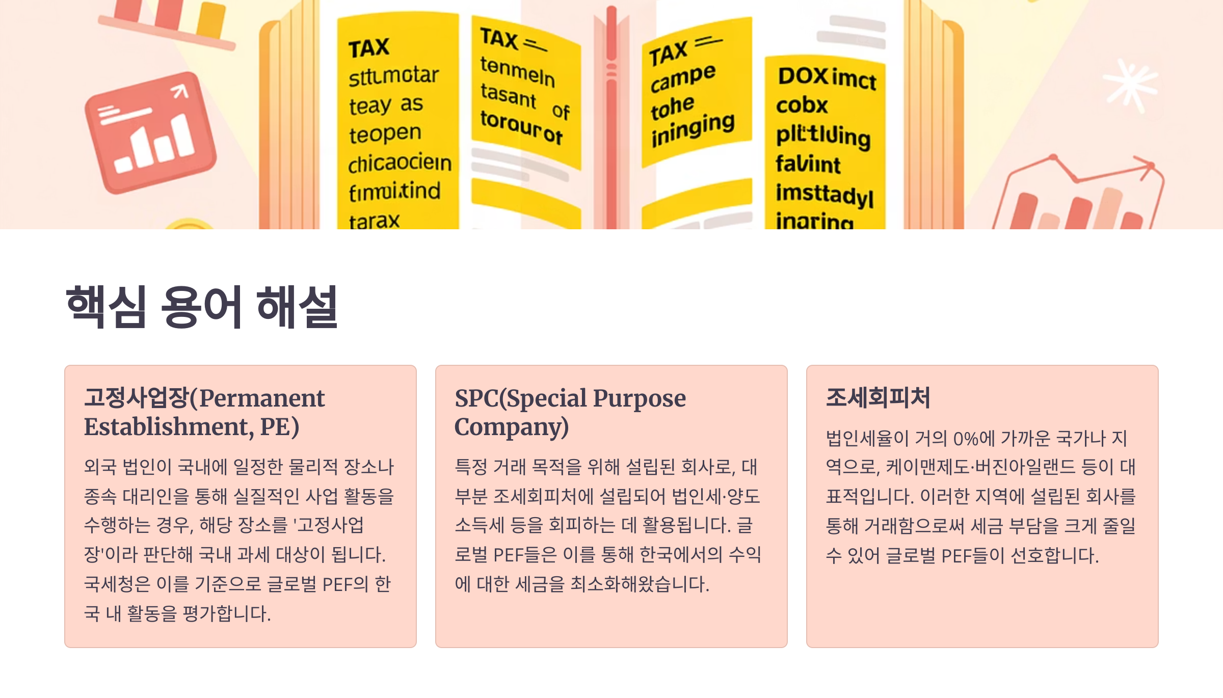 PEF, 조세회피, 고정사업장, SPC 등 한 번쯤은 들어봤지만 정확히 몰랐던 개념들도 쉽게 이해할 수 있도록 설명합니다.