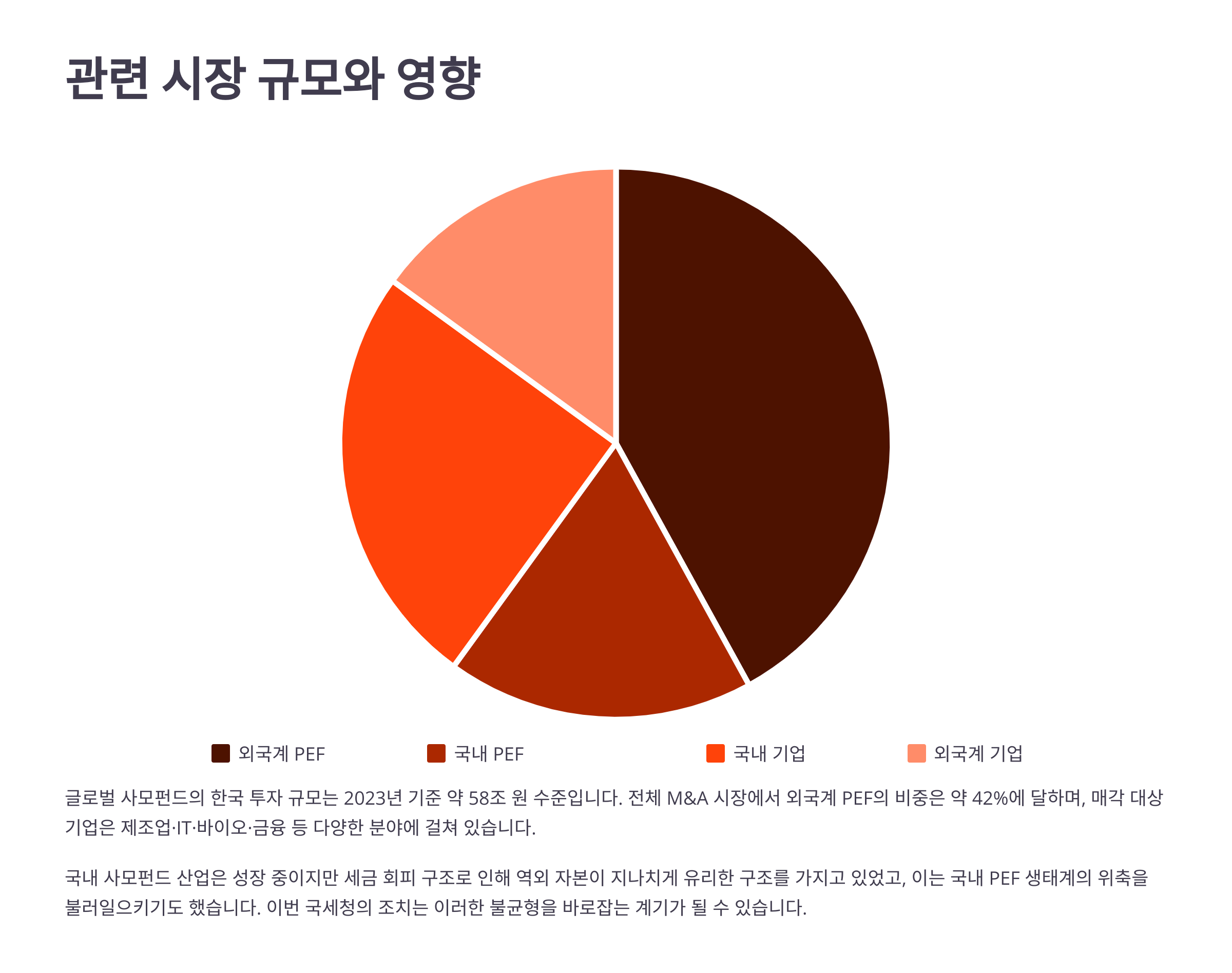 글로벌 사모펀드의 한국 투자 규모는 2023년 기준 약 58조 원 수준입니다. 전체 M&A 시장에서 외국계 PEF의 비중은 약 42%에 달하며, 매각 대상 기업은 제조업·IT·바이오·금융 등 다양한 분야에 걸쳐 있습니다.