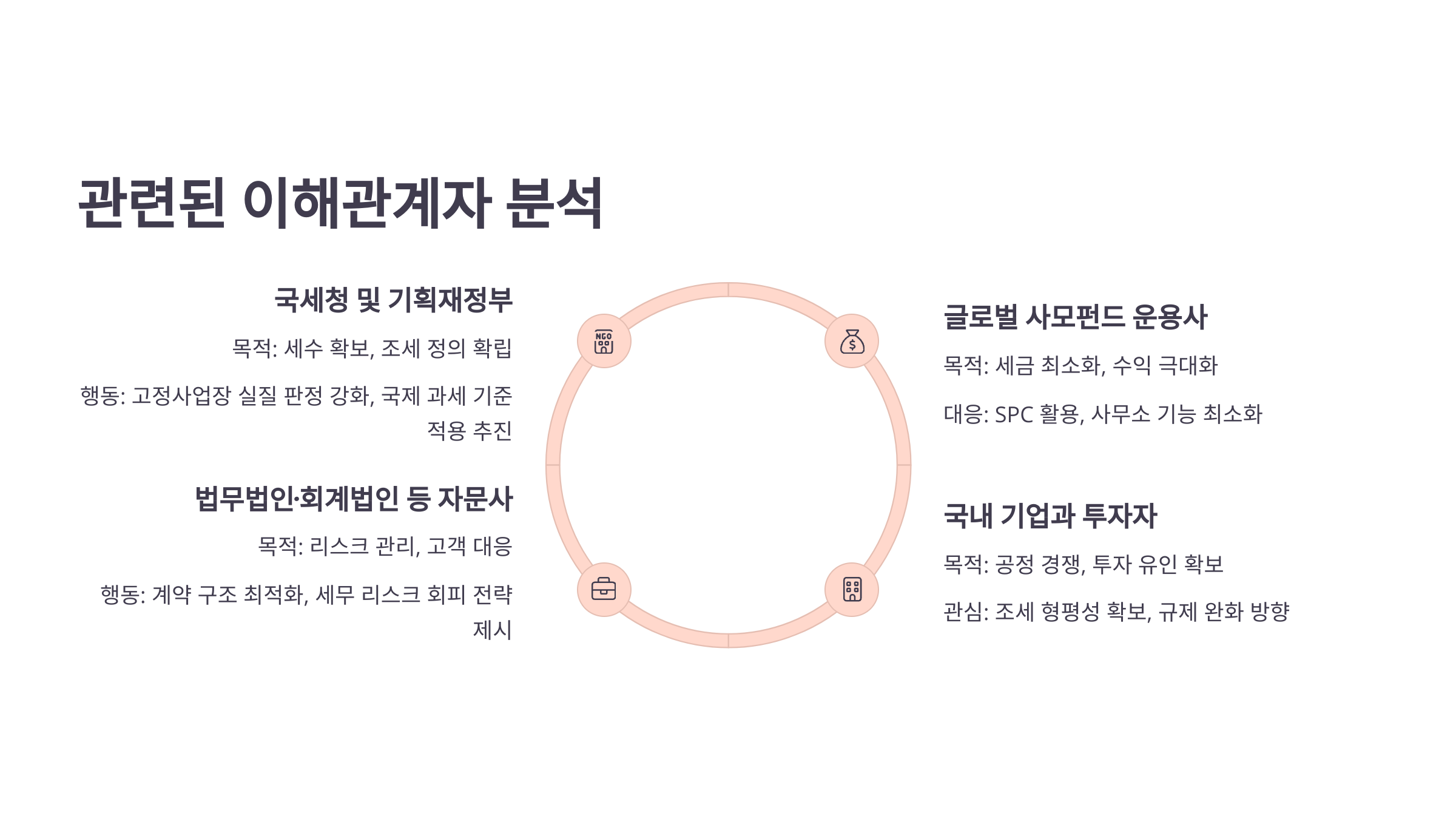 행동: 고정사업장 실질 판정 강화, 국제 과세 기준 적용 추진 - 글로벌 사모펀드 운용사(KKR, 어피너티, 칼라일 등)