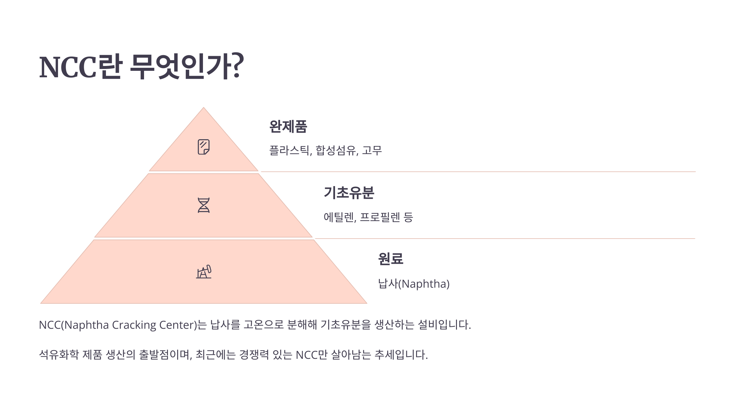 NCC(Naphtha Cracking Center)는 납사를 고온으로 분해해 에틸렌·프로필렌 등 기초유분을 생산하는 설비입니다. 이 기초유분은 플라스틱, 합성섬유, 고무 등의 원료가 되며, 대부분의 석유화학 제품의 출발점입니다.