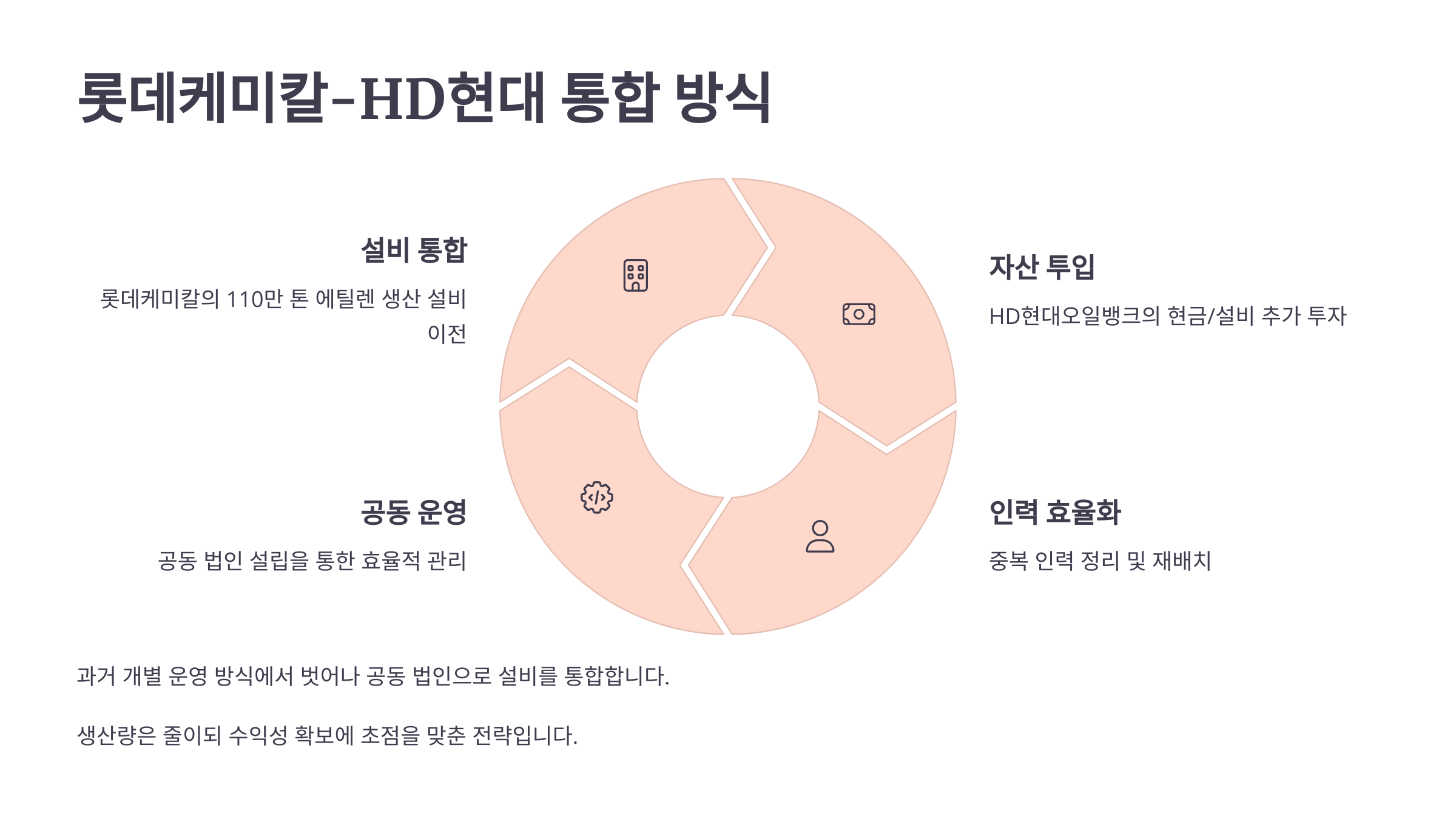 롯데케미칼이 보유한 110만 톤 규모의 에틸렌 생산 설비를 HD현대케미칼로 넘기고, HD현대오일뱅크가 현금이나 설비를 추가로 투입해 공동 운영하는 방식이 유력합니다. 이는 CAPEX(자본지출) 감소, OPEX(운영비용) 절감, 중복 인력 정리라는 세 가지 효과를 동시에 기대할 수 있는 모델입니다.