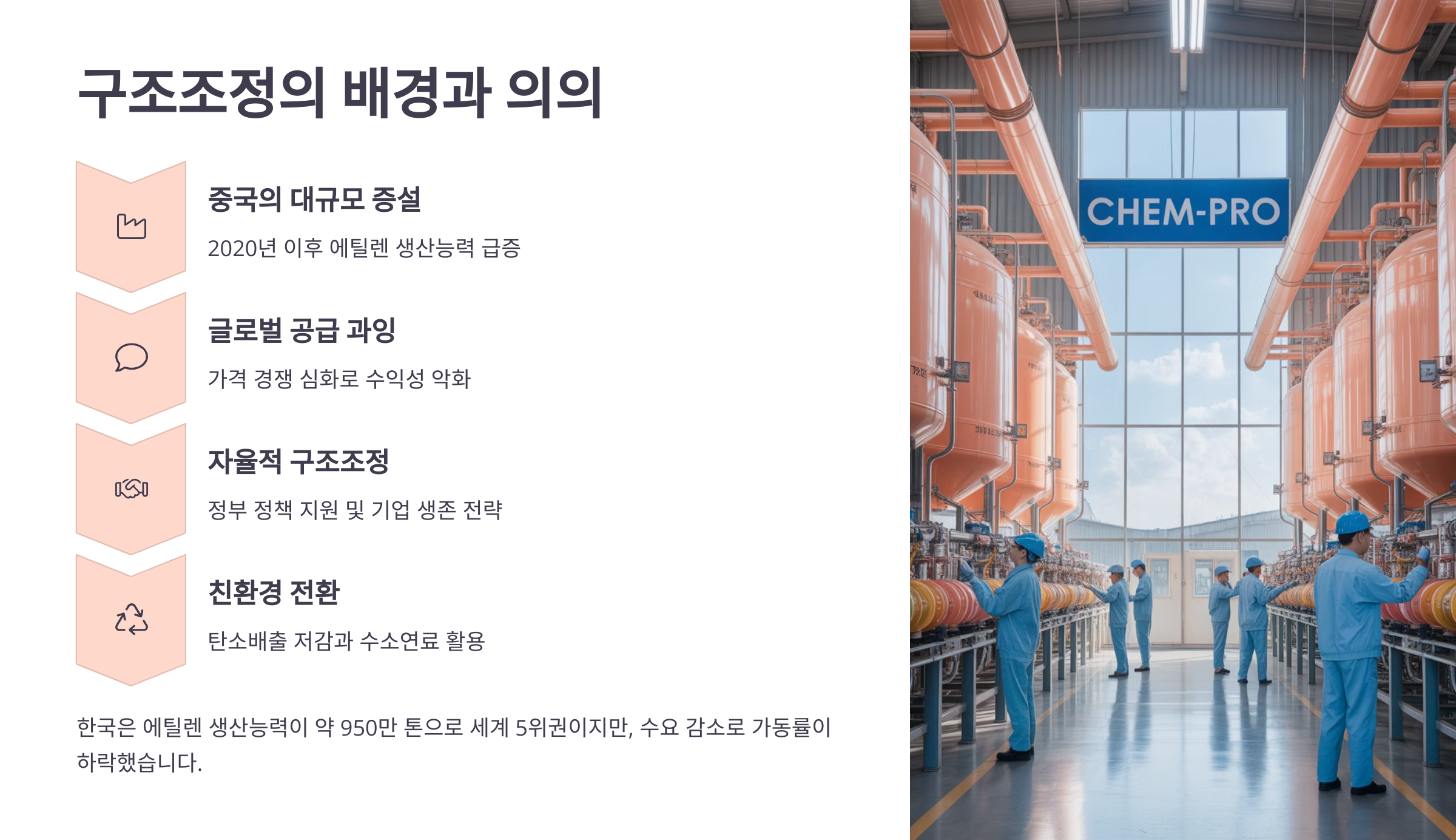 이번 통합은 중국산 화학제품의 대량 수출로 인한 가격 경쟁 심화가 핵심 원인입니다. 특히 에틸렌 시장의 경우, 중국이 2020년 이후 대규모 증설을 단행하며 공급과잉 상태가 지속되고 있습니다. 한국은 에틸렌 생산능력이 약 950만 톤으로 세계 5위권이지만, 국내 내수와 수출 수요 모두 감소하면서 가동률 하락이 이어졌습니다.