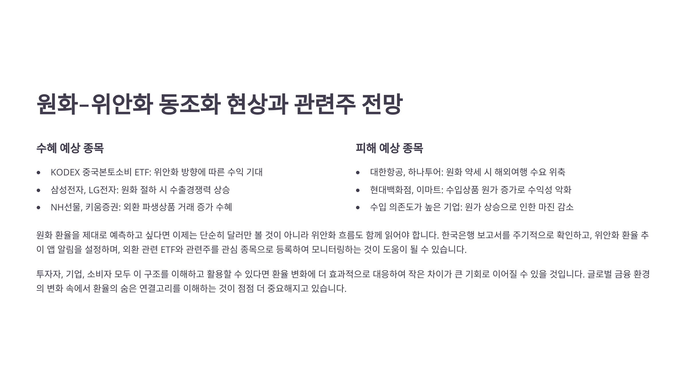 - 위안화 환율 변동 → 원화 자동 반응 → 수출 기업 채산성 타격
