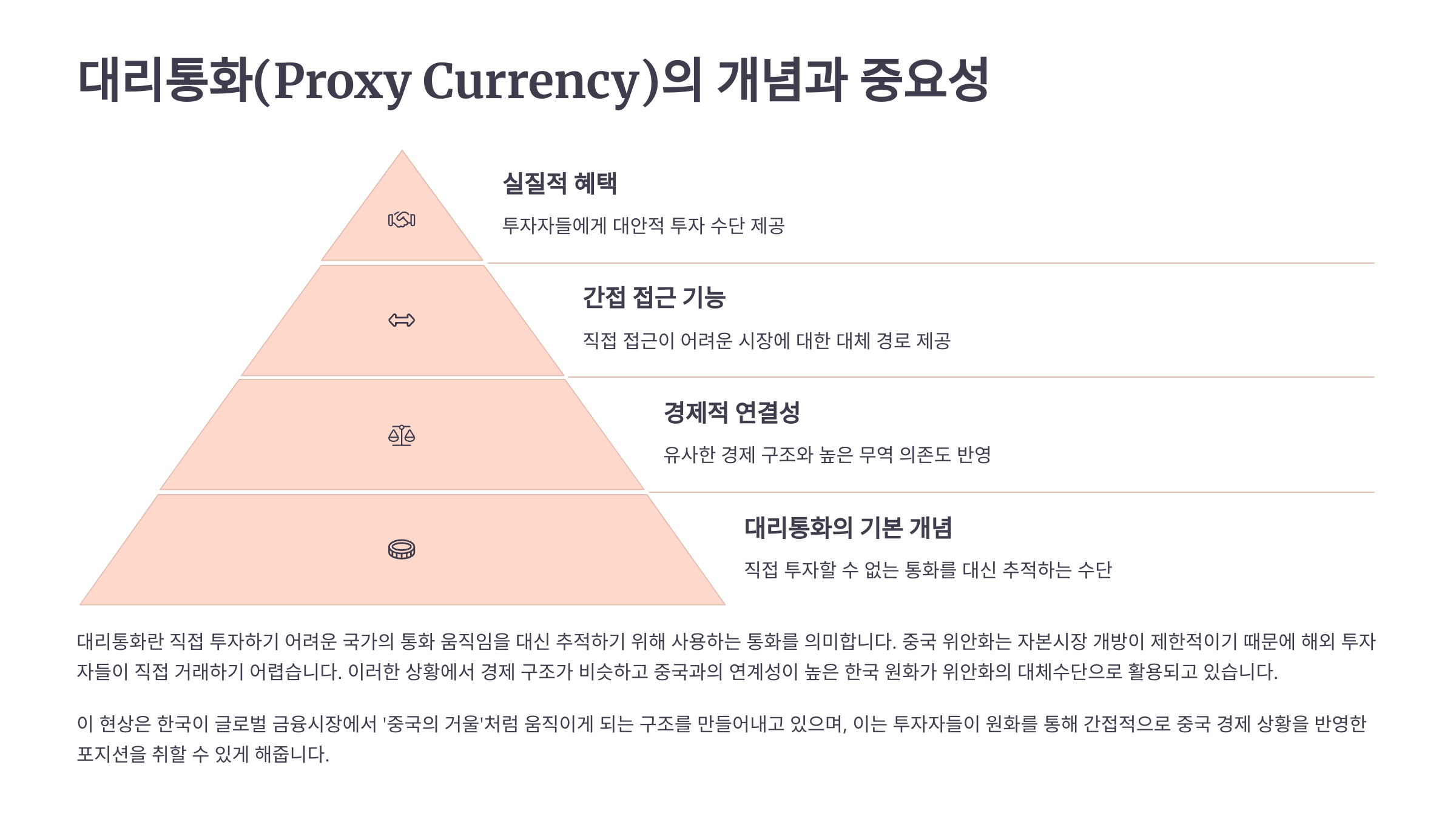 대리통화란, 직접 투자할 수 없는 국가의 통화 움직임을 대신 추적하기 위해 사용하는 통화를 뜻합니다. 중국 위안화는 자본시장 개방이 제한적이라 해외 투자자들이 직접 거래하기 어렵습니다. 이때 경제 구조가 비슷하고 중국과 연계성이 높은 한국 원화가 대체수단으로 쓰입니다. 이 현상은 한국이 글로벌 금융시장에서 ‘중국의 거울’처럼 움직이게 되는 구조를 만들고 있습니다.