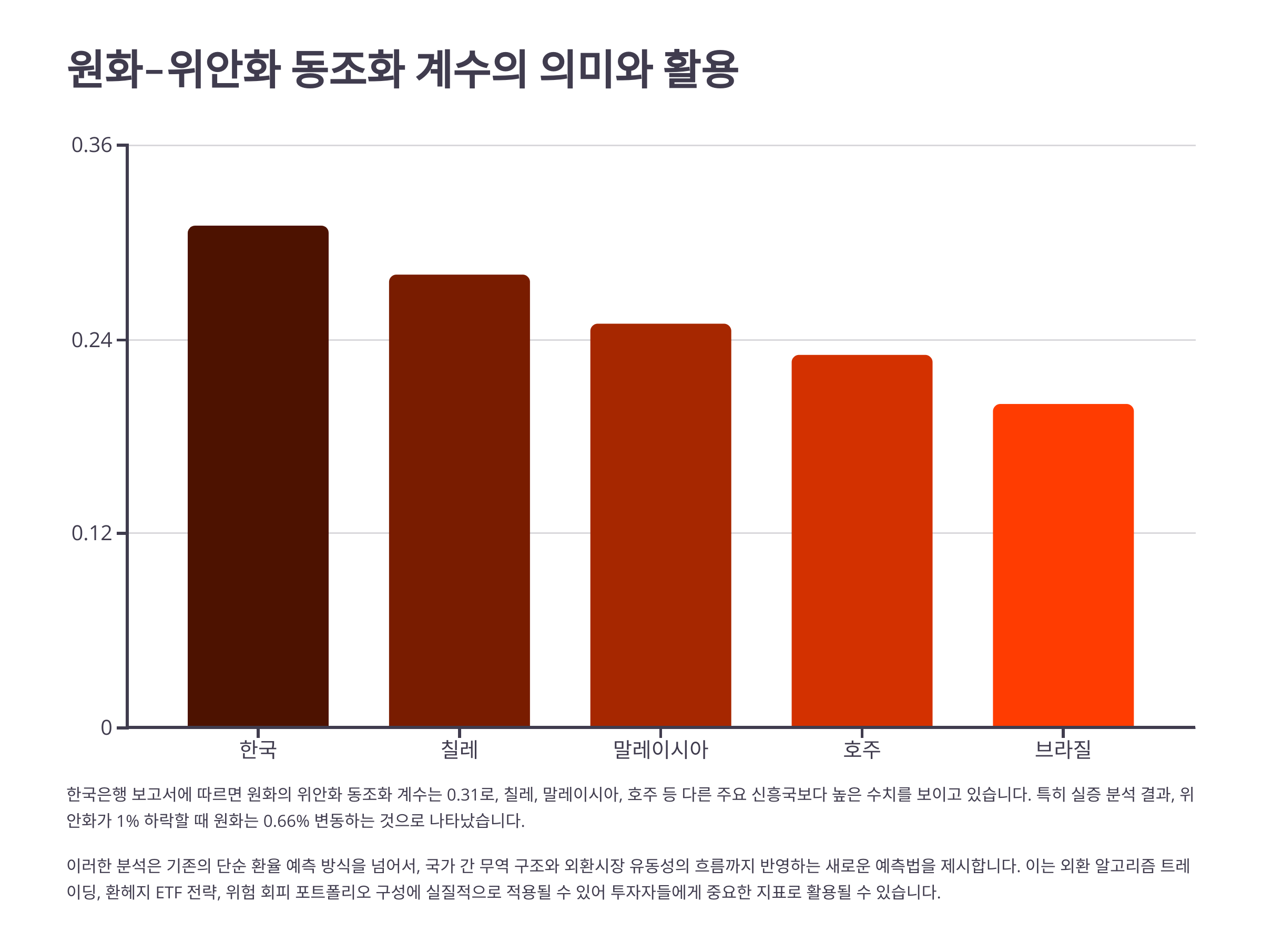 한국은행 보고서에 따르면 원화의 위안화 동조화계수는 0.31, 이는 칠레, 말레이시아, 호주 등 다른 주요 신흥국보다 높은 수치입니다. 특히 위안화가 1% 하락할 때 원화는 0.66% 변동한다는 실증 분석 결과가 이를 뒷받침합니다.